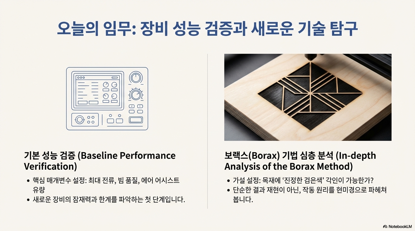 오늘 우리는 두 가지 흥미로운 발견을 했습니다. 첫째, 붕사라는 평범한 재료가 가설과 검증을 통해 나무의 셀룰로오스 구조를 변화시켜 빛을 흡수하는 3D 골격을 만들어낸다는 놀라운 과학적 원리. 둘째, 아날로그 노브로 최대 전류를 물리적으로 제한하여 고가의 레이저 튜브를 안전하게 보호하는 새로운 장비의 스마트한 기능.