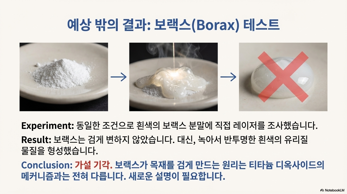 같은 실험을 순수한 붕사 가루에 반복했습니다. 하지만 결과는 예상과 달랐습니다. 붕사 가루는 레이저 열에도 불구하고 검게 변하지 않았습니다. 오직 나무와 함께 있을 때만 검은색 효과가 나타난 것입니다. 이로써 첫 번째 가설, 즉 붕사 자체가 변하는 것이라는 추측은 완전히 기각되었습니다. 이것은 이산화티타늄과는 전혀 다른 메커니즘이 작동하고 있음을 의미했습니다.