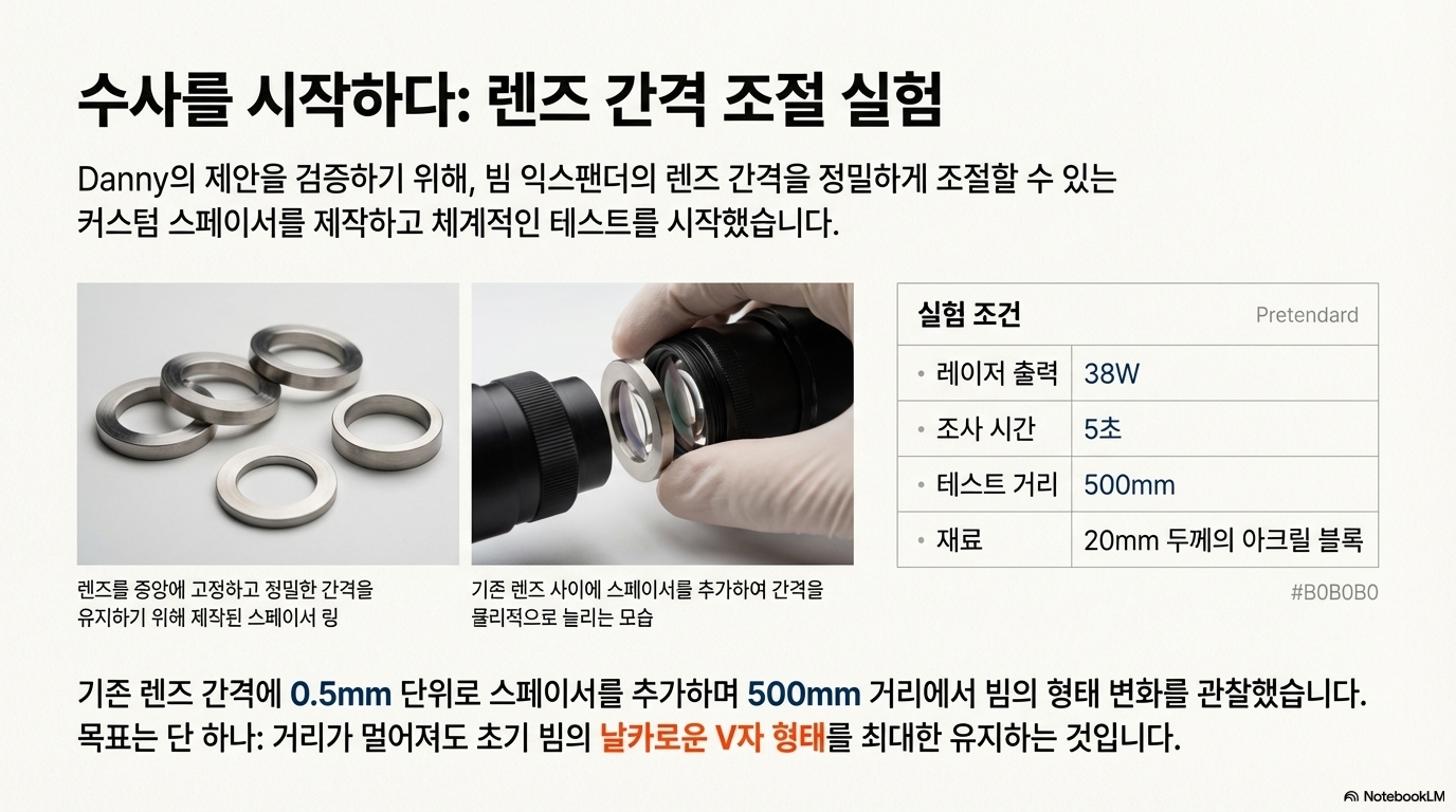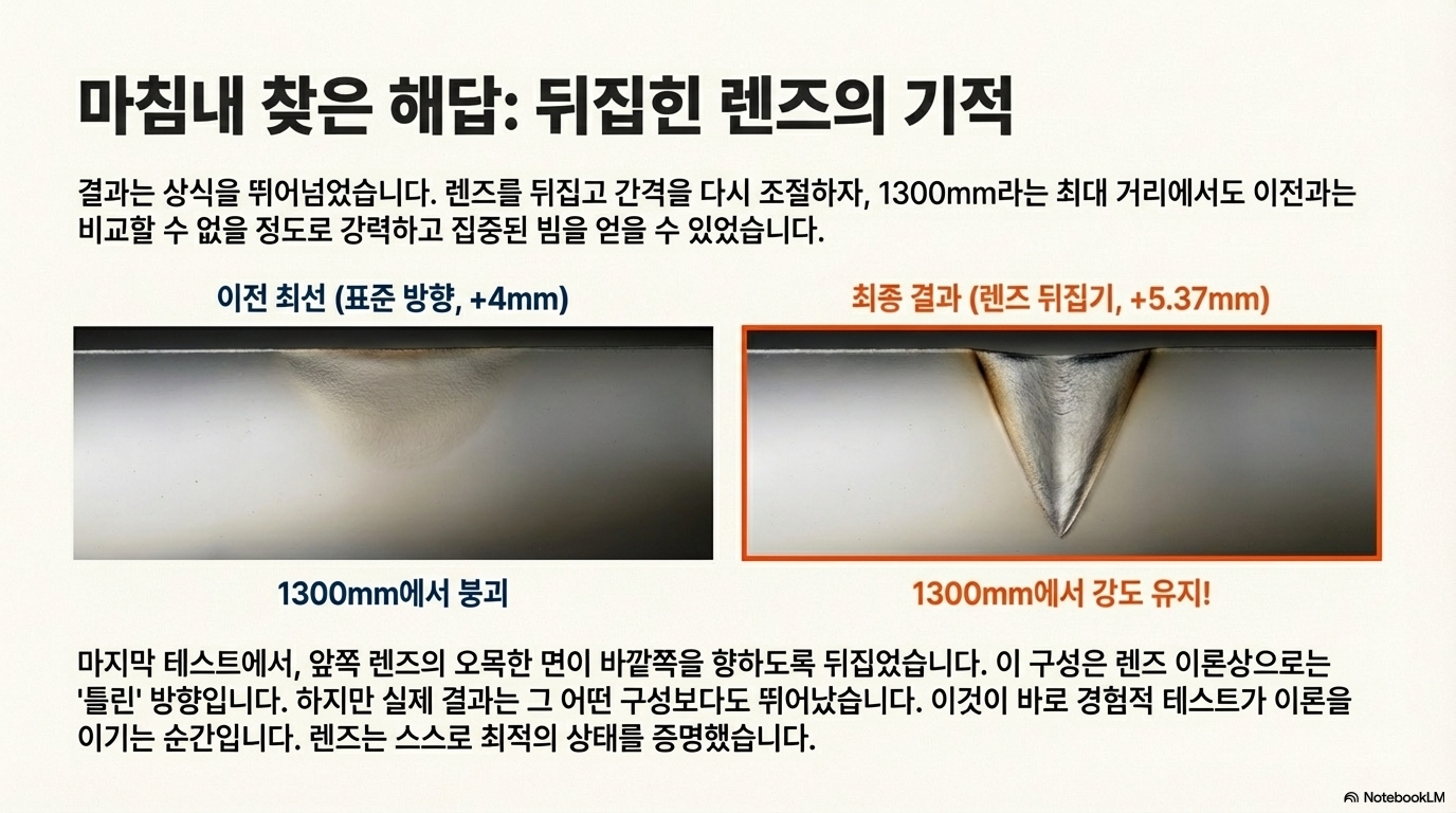 이 좌절의 순간, 그는 교과서를 완전히 던져버리기로 결심했습니다. 마지막 실험에서 그는 렌즈들을 공급받았을 때와 "완전히 정반대 방향"으로 뒤집었습니다. 렌즈 간격을 거의 6mm 늘리고 렌즈 방향을 뒤집는 이 비정상적인 조합은 마침내 최고의 결과를 낳았습니다. 이 "잘못된" 설정이 "올바른" 공장 설정보다 훨씬 더 강하고 강렬한 빔을 먼 거리까지 유지해 주었던 것입니다. 이는 이처럼 미묘하고 특정한 목표에 있어서 최적의 해결책은 모든 전통적인 지혜와 설계 원칙을 거스르는 것에서 나올 수 있음을 증명합니다.