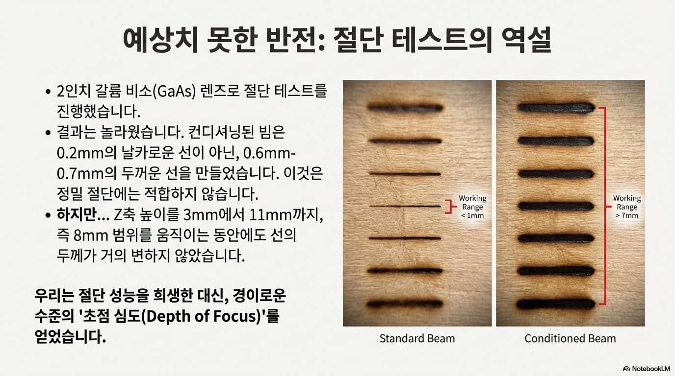 결과는 경이로웠습니다. 이 '빔 컨디셔닝' 덕분에, 2인치 갈륨 비소(Gallium Arsenide, GaAs) 렌즈의 유효 작동 범위, 즉 '초점 심도(depth of focus)'가 기존 1mm 미만에서 약 7mm까지 폭발적으로 늘어났습니다. 다른 재료인 아연 셀렌화물(Zinc Selenide) 렌즈가 이 구성에서 "완전한 쓰레기"였던 것과 비교하면 더욱 놀라운 결과였습니다. 이는 렌즈가 정확한 초점 거리에 훨씬 덜 민감해졌음을 의미합니다.