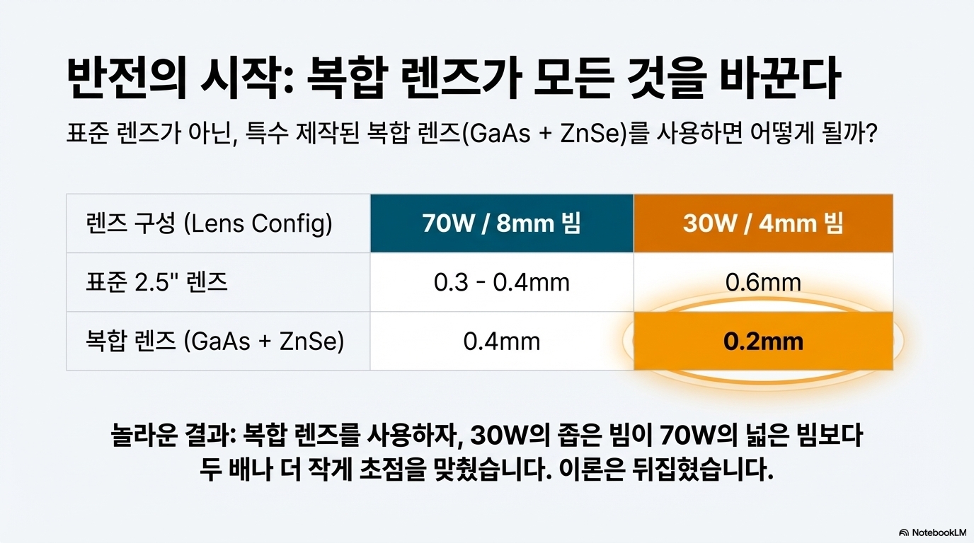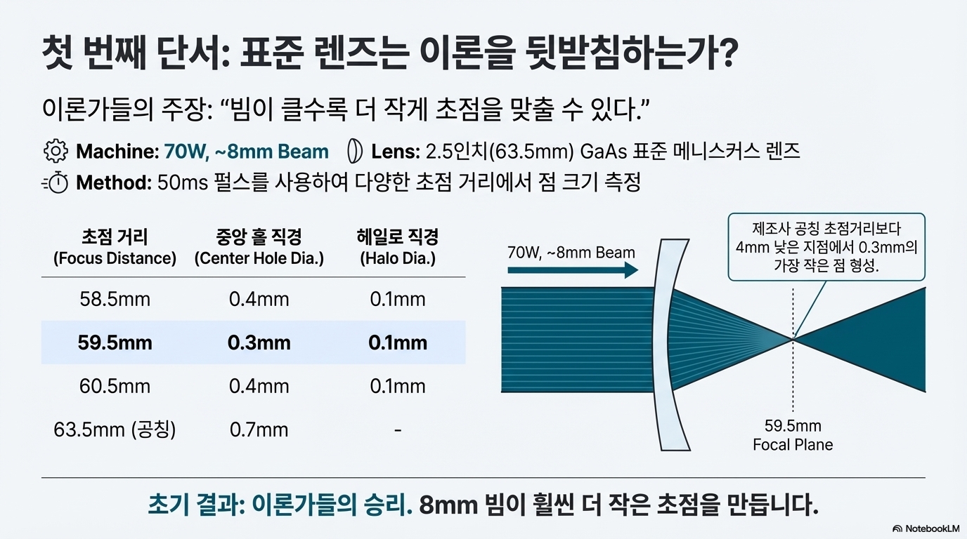모든 렌즈에는 제조업체가 명시한 '초점 거리'가 있습니다. 하지만 실험 결과, 최대 강도(가장 작고 깊은 구멍)를 만들어내는 실제 초점 지점은 이 숫자와 일치하지 않았습니다.