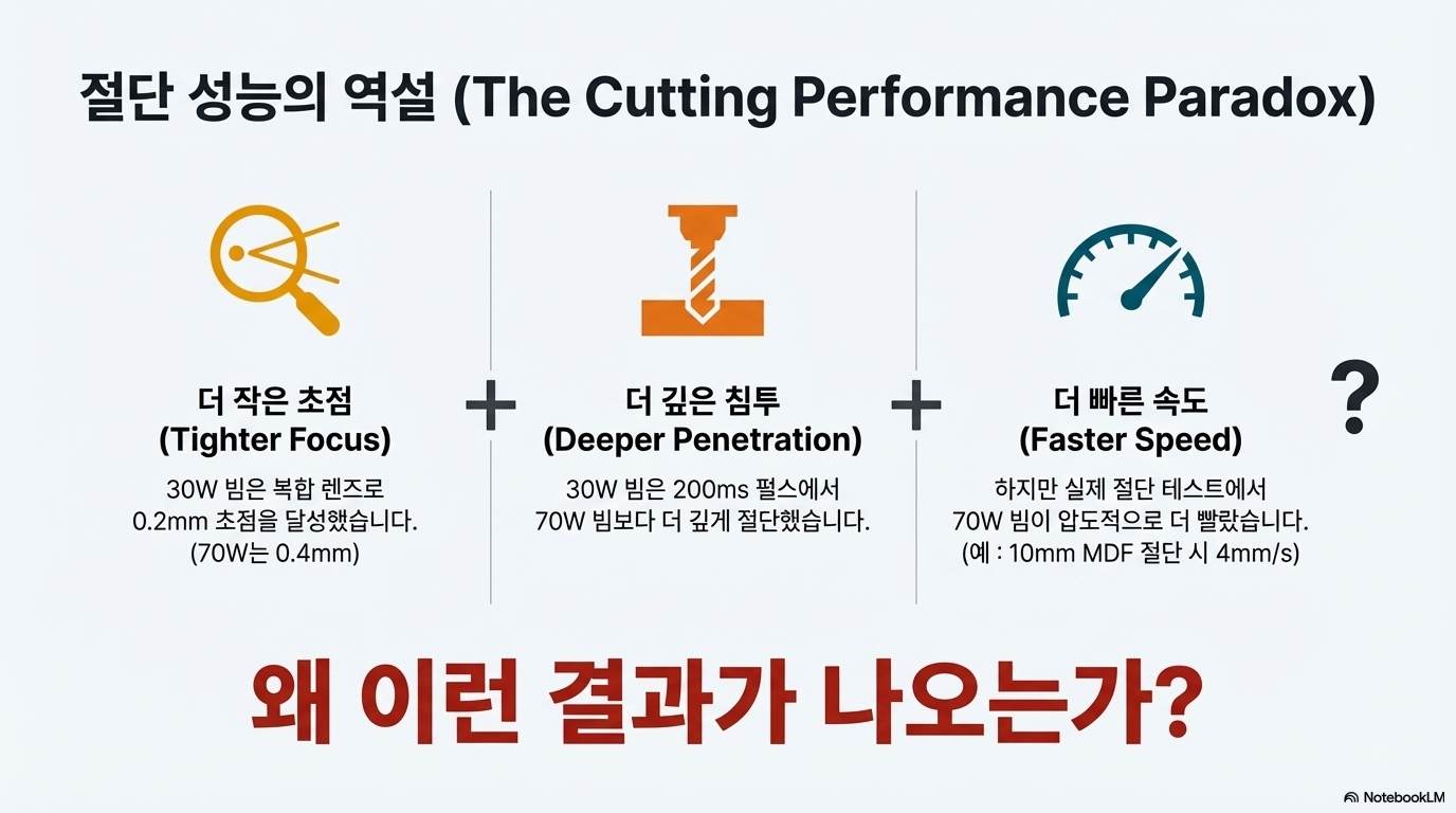 왜 이런 일이 발생할까요? 강도 높은 30W '토끼'는 깊고 좁은 채널을 '뚫는(drilling)' 데는 탁월하지만, 그 채널을 넓히고 재료를 효율적으로 제거하는 데 필요한 총에너지('갈색 물질')가 부족합니다. 반면 70W '거북이'는 최고 강도는 낮지만 더 많은 총출력을 바탕으로 25밀리초 동안 꾸준히 재료를 기화시키며 결국 더 깊은 절단을 완성합니다. 이 실험은 '커팅 몬스터'를 만들려던 시도가 의도치 않게 '인그레이빙 몬스터'를 탄생시켰다는 것을 보여줍니다. 30W 빔의 능력은 고속 절단이 아닌, 고해상도 사진 조각에 이상적이었습니다.