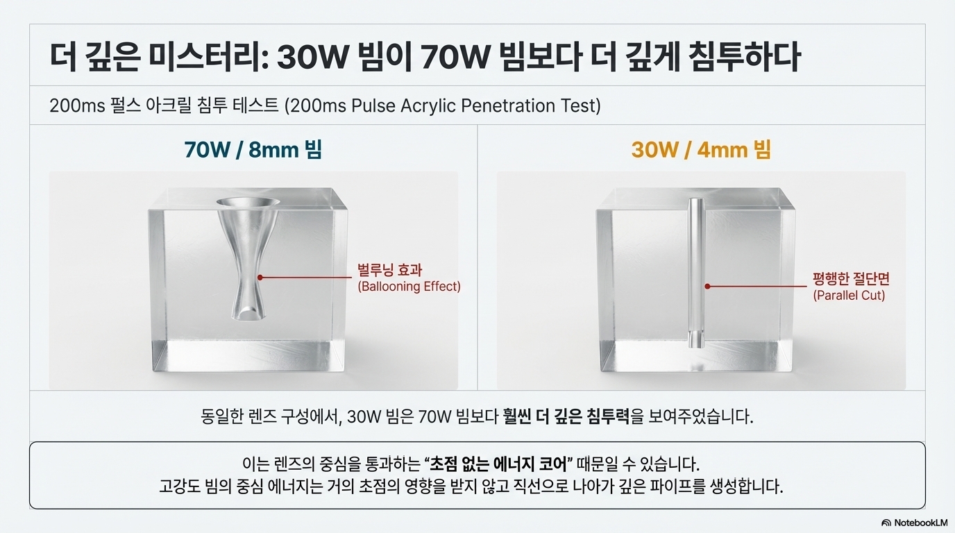 단거리 경주, 즉 2밀리초 같은 매우 짧은 펄스에서는 '토끼'(30W 빔)가 압도적이었습니다. 믿을 수 없을 만큼 빠른 속도로 재료를 깊이 파고들어 엄청난 잠재력을 보여주었습니다. 반면 '거북이'(70W 빔)는 시작이 훨씬 느렸습니다.