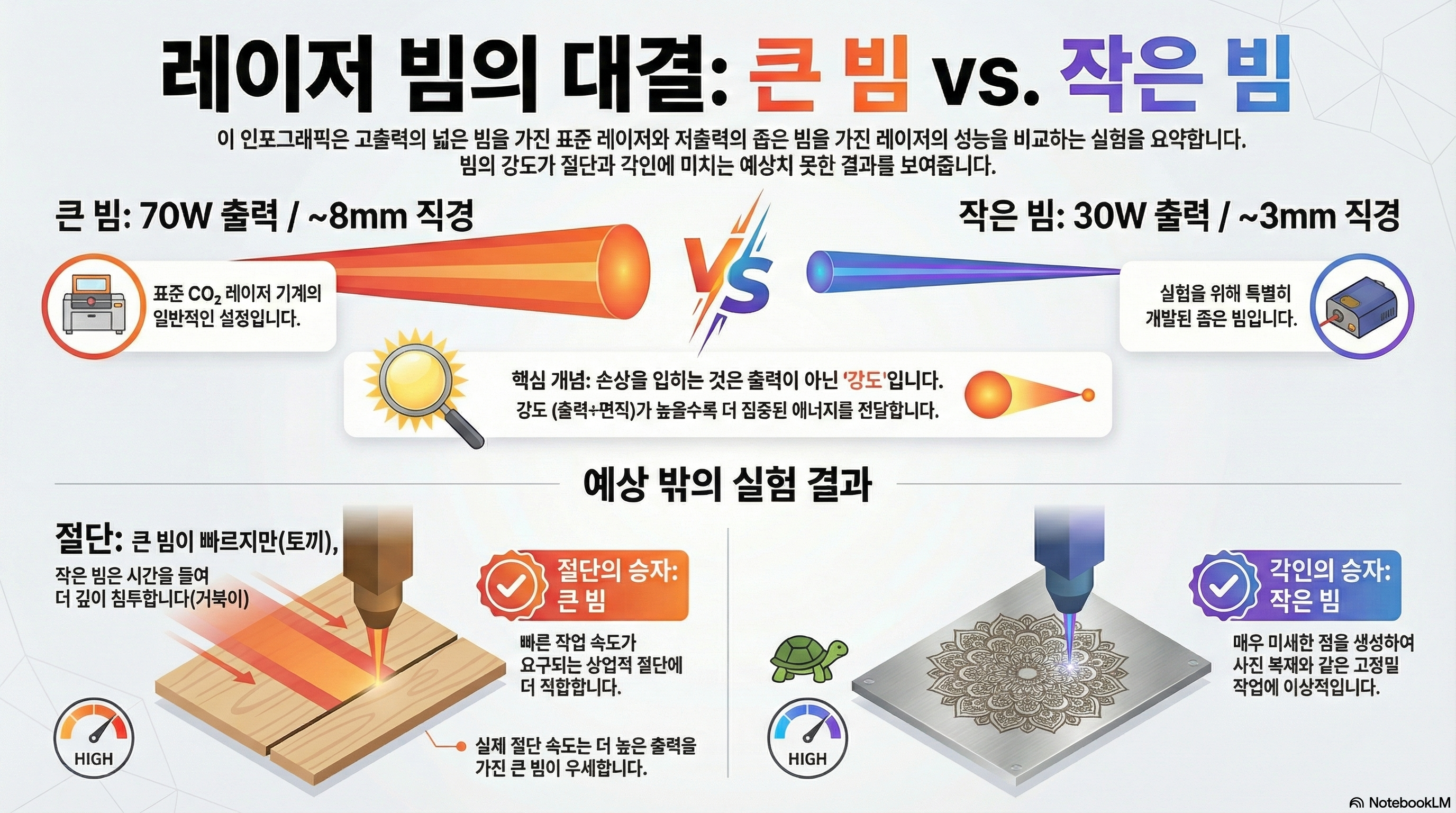 이는 변수를 완벽히 통제한 상태에서, 힘이 아닌 강도가 핵심임을 증명합니다. 동일한 양의 에너지("갈색 물질"이라고 상상해봅시다)를 넓게 펼치면 강도는 낮아지고, 좁은 곳에 집중시키면 강도는 기하급수적으로 높아집니다. 이 개념은 레이저 커팅의 모든 것을 이해하는 출발점입니다.