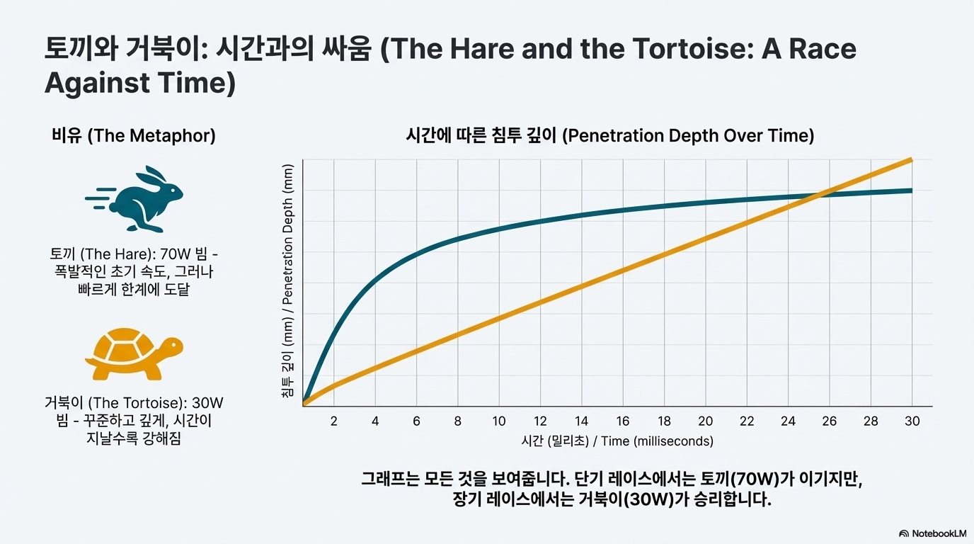 마지막으로, 실험은 우리에게 토끼와 거북이 우화와 같은 교훈을 주었습니다. 여기서 **'토끼(Hare)'**는 믿을 수 없는 초기 관통력을 보여주는 좁고 강도 높은 30W 빔입니다. **'거북이(Tortoise)'**는 시작은 느리지만 꾸준한 70W의 넓은 빔입니다.