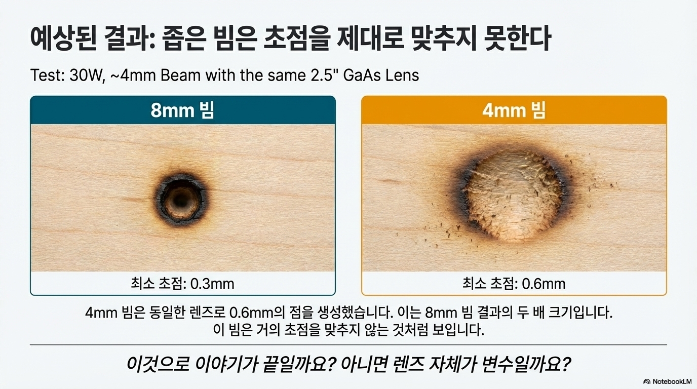 레이저 커팅 커뮤니티에는 "렌즈에 닿는 빔의 직경이 클수록 초점은 더 작고 정밀해진다"는 이론이 널리 퍼져 있습니다. 실험 초기에는 이 이론이 맞는 것처럼 보였습니다. 실제로 8mm 빔은 0.3mm의 초점을 만들어냈고, 4mm 빔은 0.6mm의 초점을 만들어냈습니다. 이론가들의 완승처럼 보였습니다.