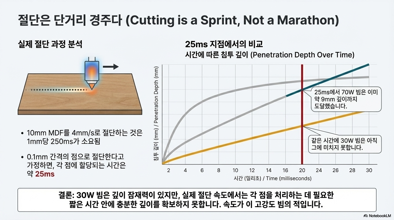하지만 실제 절단 작업은 장거리 경주와 같습니다. 계산에 따르면, 일반적인 절단 속도에서 한 점을 자르는 데 걸리는 시간은 약 25밀리초입니다. 이 시간 동안 놀라운 반전이 일어났습니다. '토끼'(30W 빔)는 초반의 기세를 잃고 진행이 정체된 반면, '거북이'(70W 빔)는 꾸준히 깊이를 더해가며 결국 경주에서 승리했습니다.