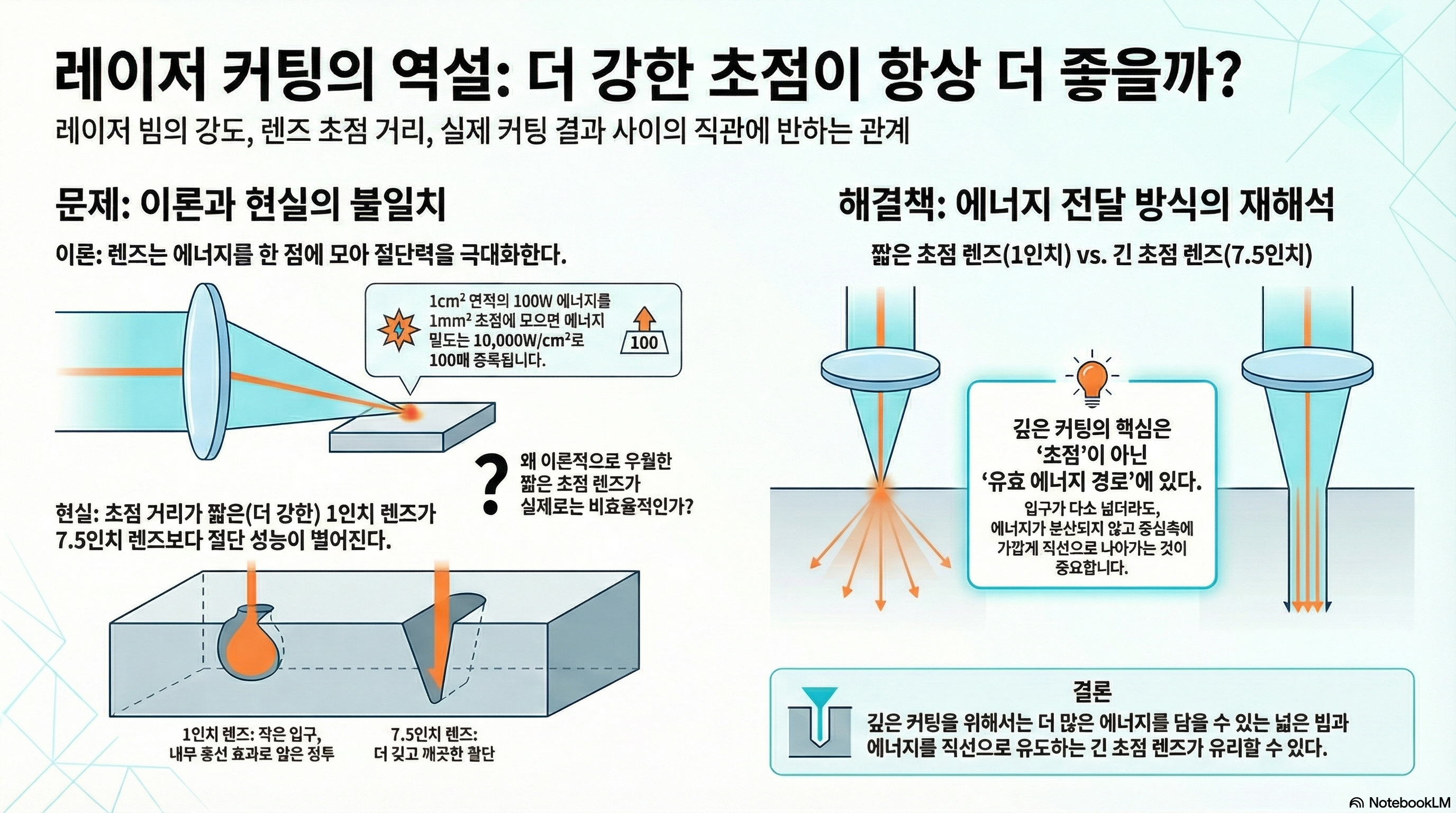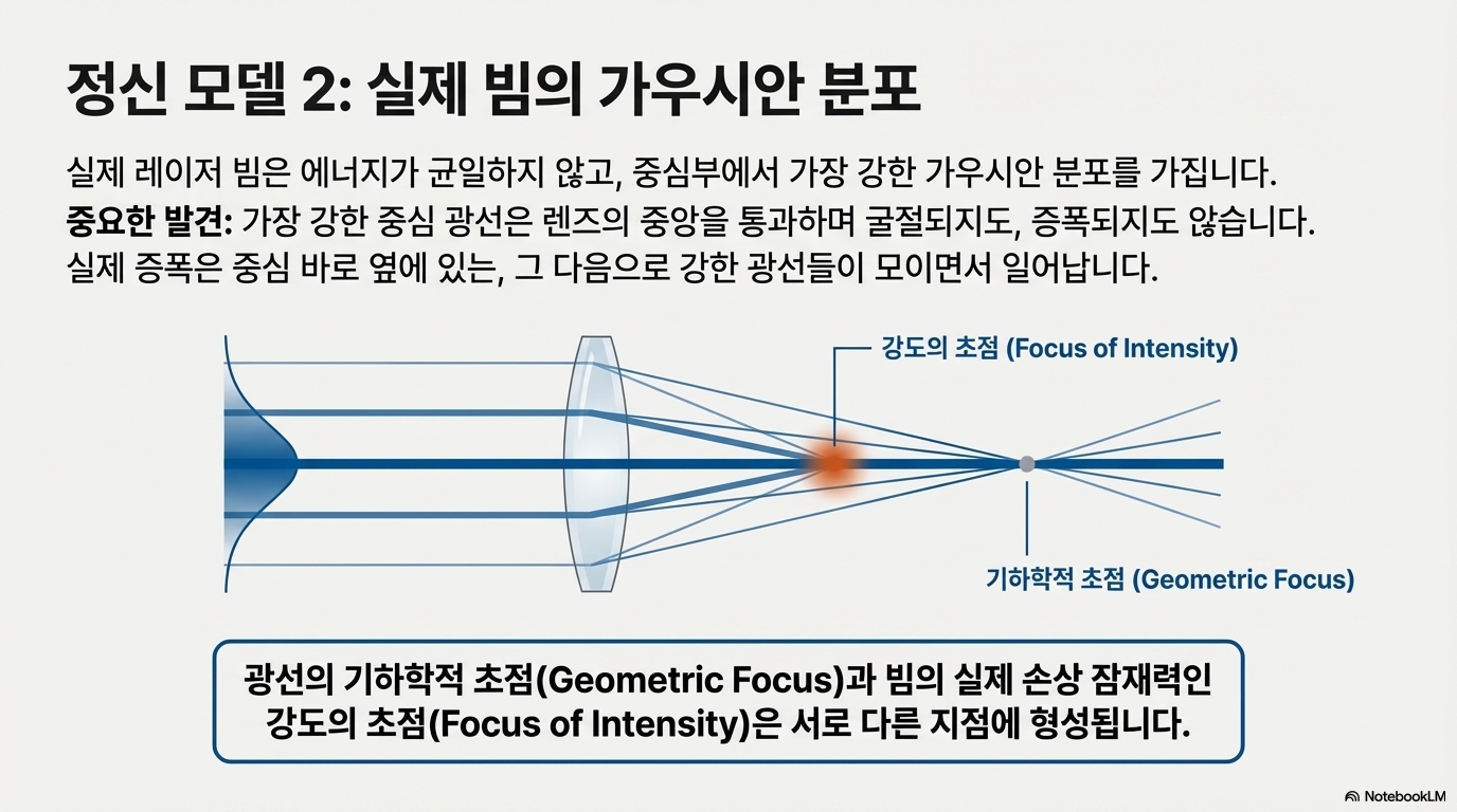 이는 레이저 가공을 순수한 '광학 기하학'으로만 이해해서는 안 된다는 결정적인 증거입니다. 광선이 수학적으로 모이는 지점보다, 재료가 실제로 손상되기 시작하는 '에너지 임계값'을 넘는 지점이 훨씬 더 중요하기 때문입니다.