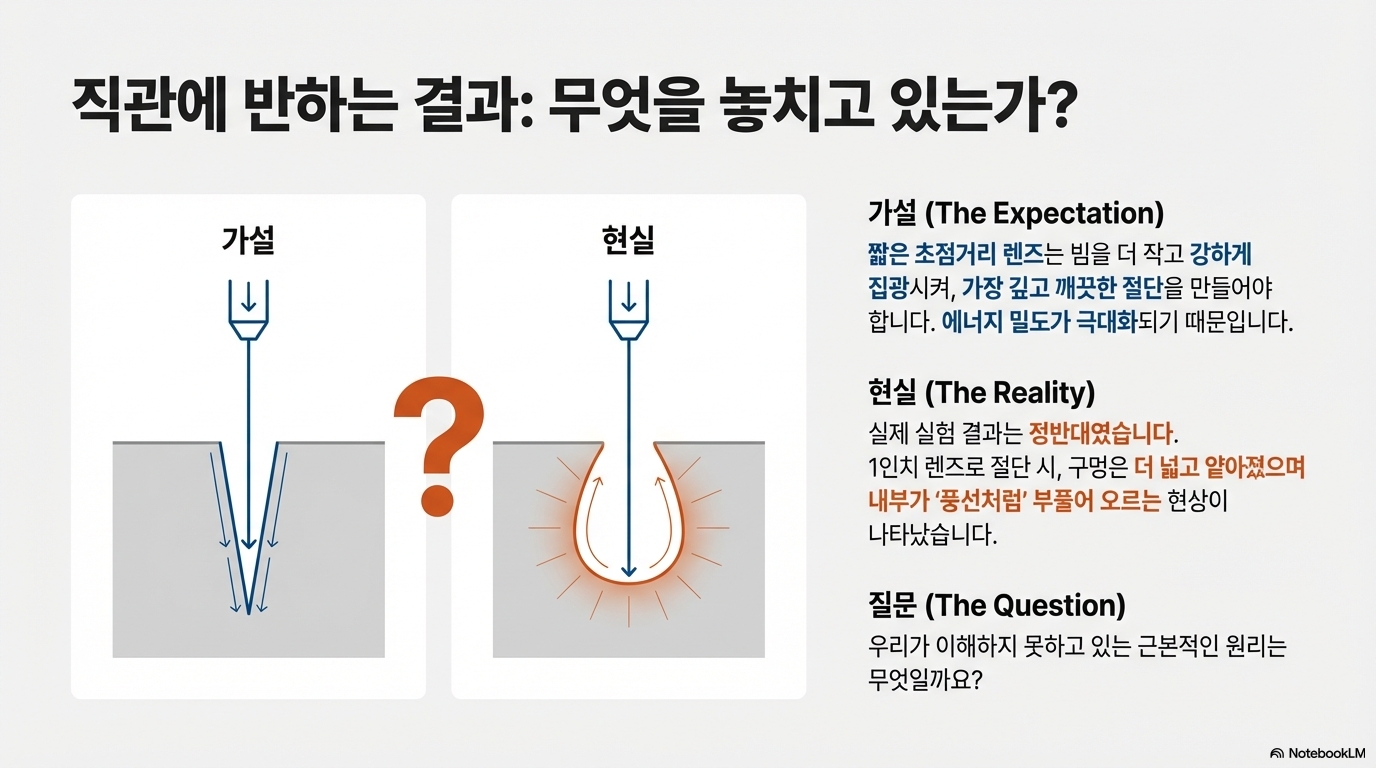 하지만 실제 레이저 가공의 세계는 이보다 훨씬 복잡하고 때로는 직관에 반하는 현상으로 가득 차 있습니다. 당연하게 여겼던 원리가 통하지 않고, 예상치 못한 결과들이 나타나곤 합니다.