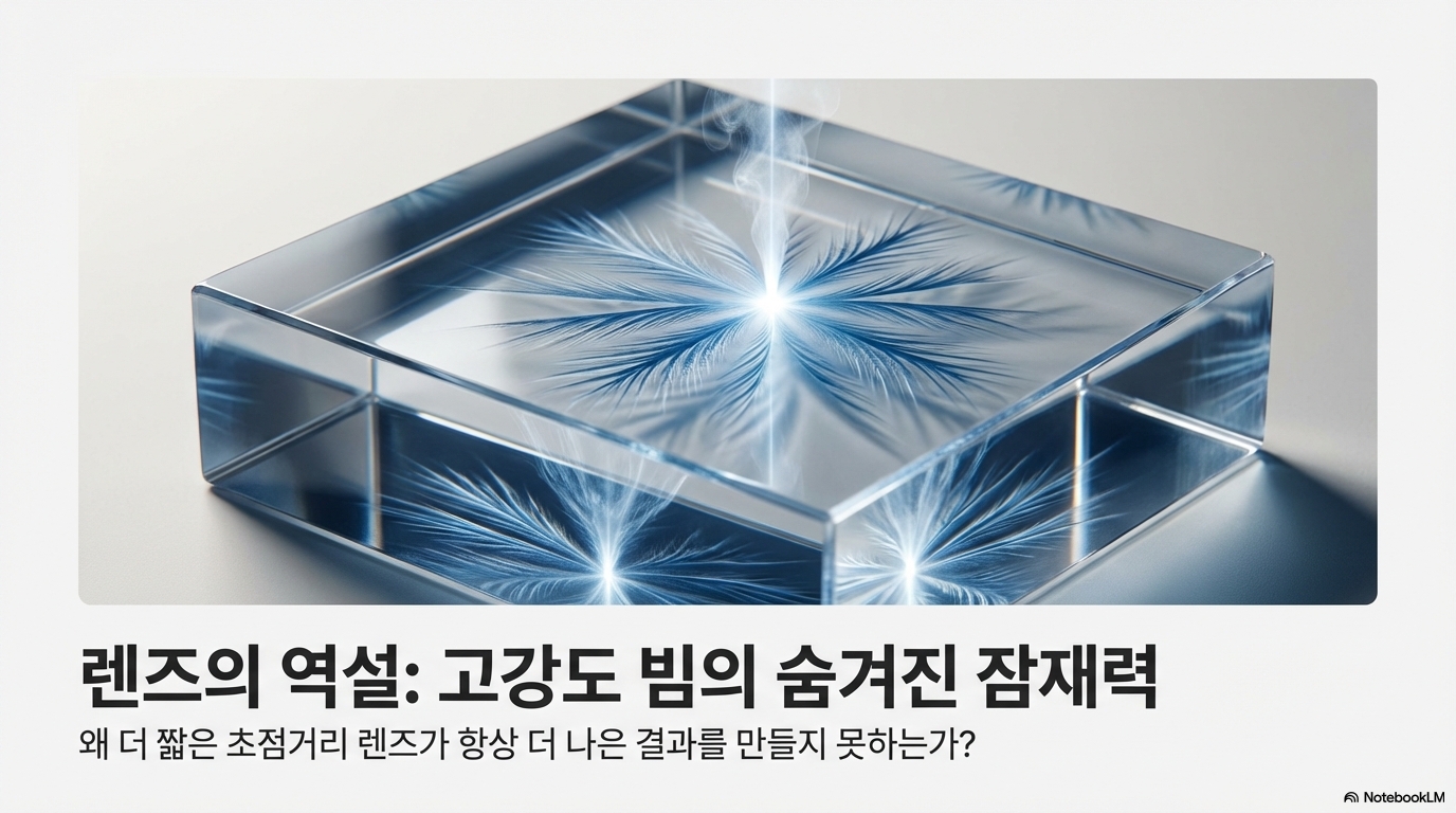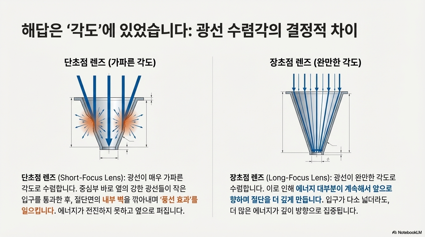 - 긴 초점 렌즈: 광선들이 훨씬 '완만한 각도'로 모입니다. 이 때문에 입구는 다소 클지라도, 에너지가 옆으로 새지 않고 더 깊이 파고드는 힘으로 곧장 작용합니다.