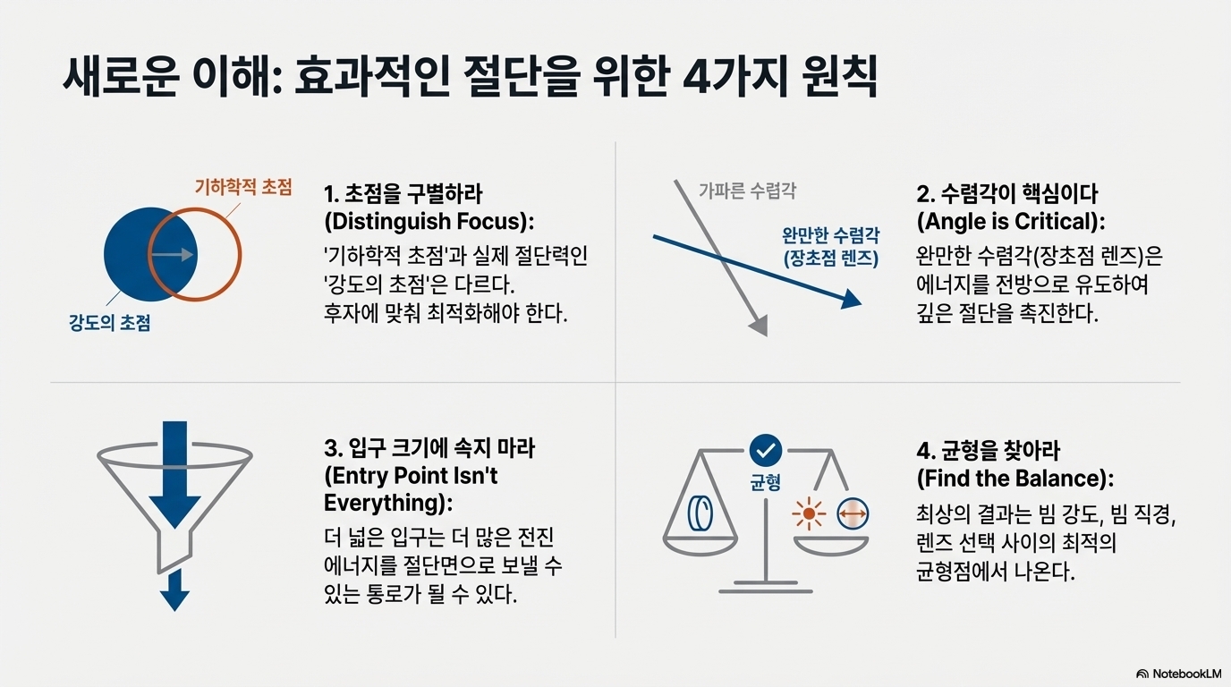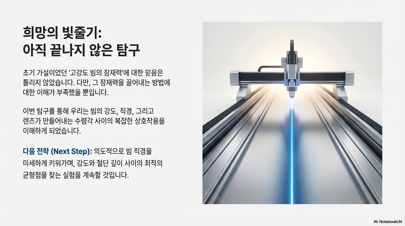 이 실험가의 여정을 통해 우리는 레이저 가공이 단순한 기하학적 원리를 넘어선 복잡한 물리 현상임을 확인했습니다. 에너지는 바깥에서 안으로 모여 형성되고, 기하학적 초점과 실제 손상을 입히는 지점은 다르며, 때로는 긴 초점 렌즈나 더 넓은 빔이 더 나은 결과를 만들기도 합니다.