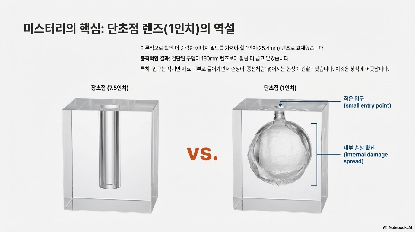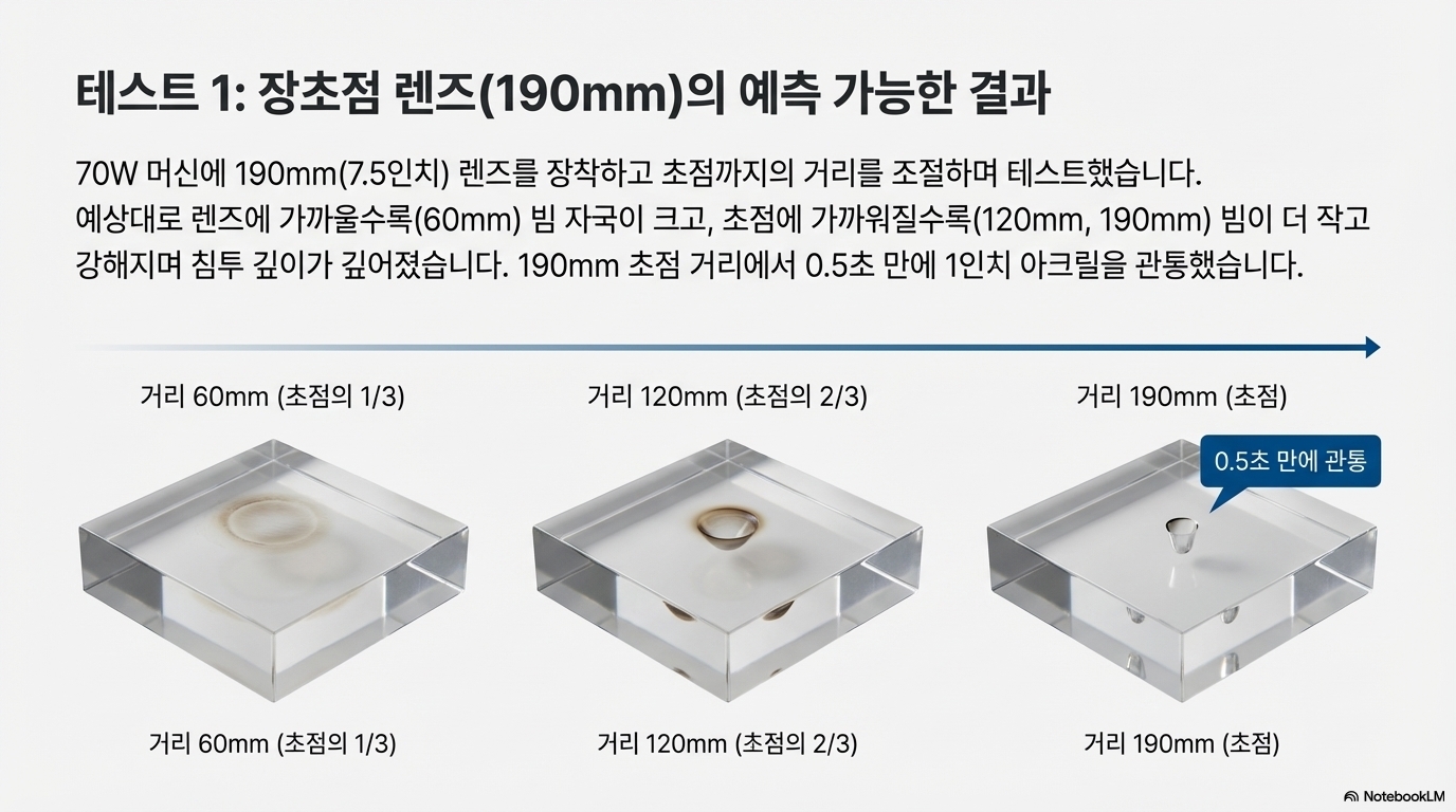 일반적인 상식은 '짧은 초점 거리의 렌즈일수록 빛을 더 작게 모아 더 강한 에너지를 만드므로 더 깊게 절단할 수 있다'입니다. 하지만 실험 결과는 이 상식을 완전히 뒤집었습니다. 1인치(짧은) 초점 렌즈는 재료에 얕고 넓게 퍼지는(ballooning) 구멍을 만든 반면, 7.5인치(긴) 초점 렌즈는 오히려 더 깊고 좁은 구멍을 만들어냈습니다.