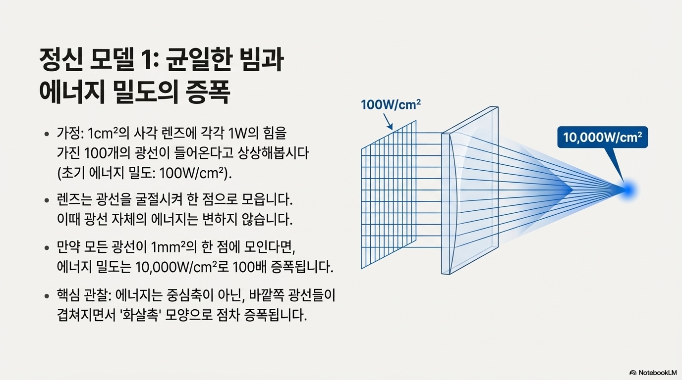 이 현상은 마치 수백 개의 작은 에너지 다발(광선)이 과녁을 향해 날아가는 '화살촉' 대형과 같습니다. 화살촉의 파괴력은 뾰족한 끝부분이 아닌, 여러 화살이 동시에 목표 지점에 집중되는 그 순간에 극대화됩니다. 마찬가지로 레이저의 힘은 초점이라는 이론적 '점'이 아니라, 수많은 광선이 중첩되며 에너지 밀도가 폭발적으로 증가하는 '영역'에서 나옵니다.