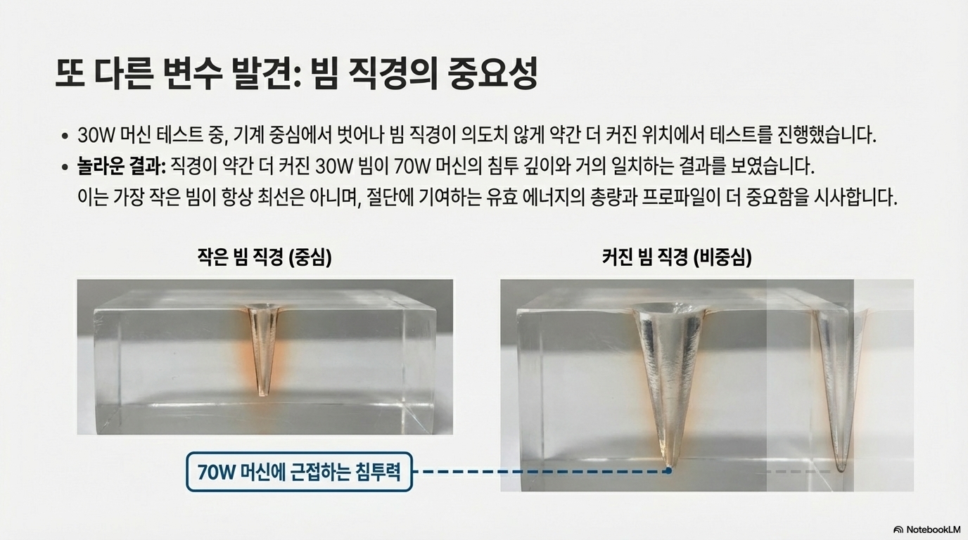 실험은 또 다른 놀라운 결과를 보여주었습니다. 30W의 상대적으로 약한 레이저 장비에서, 렌즈로 들어가는 빔의 직경을 더 넓게 조정하자 70W 장비와 거의 비슷한 침투 깊이를 달성한 것입니다.