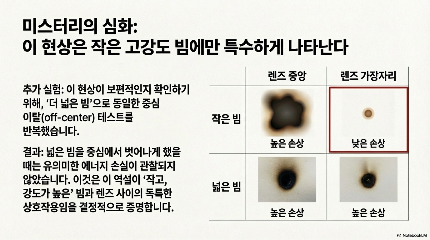 초점이 개선되었음에도 불구하고, 재료에 가해지는 손상(파워)은 오히려 눈에 띄게 줄어들었습니다. 이것은 "초점이 잘 맞으면 더 강해야 한다"는 또 다른 상식을 깨는 결과였습니다. 그런데 미스터리는 여기서 끝나지 않았습니다. 실험자는 비교를 위해 이번에는 '더 커진' 빔을 가지고 동일하게 중심에서 벗어나게 하는 실험을 진행했습니다. 놀랍게도, 큰 빔을 중심에서 벗어나게 했을 때는 파워 손실이 거의 없었습니다.
