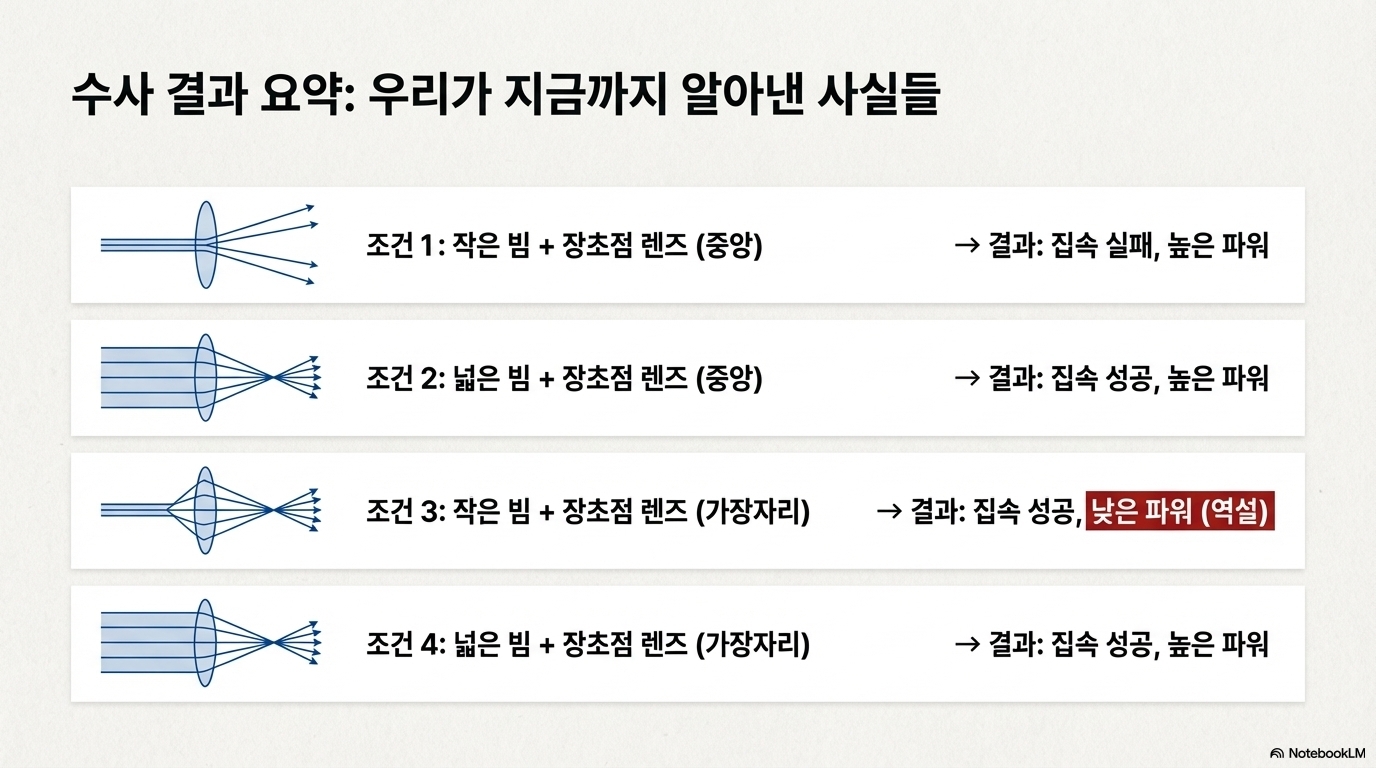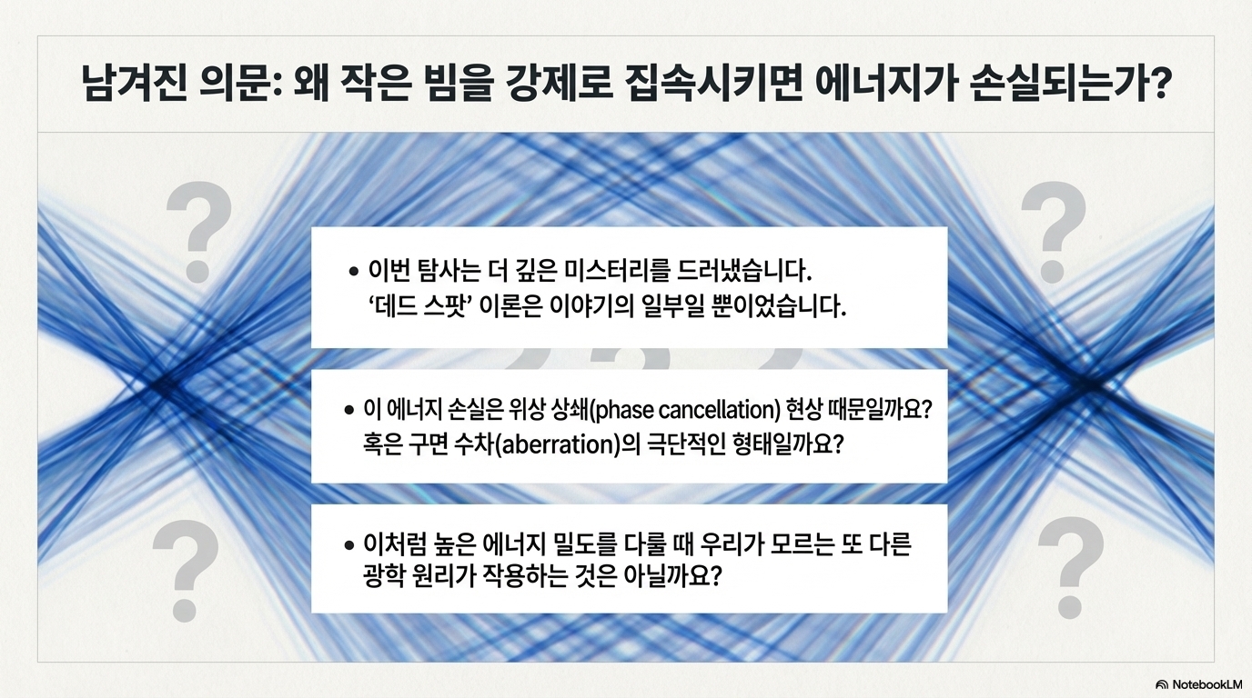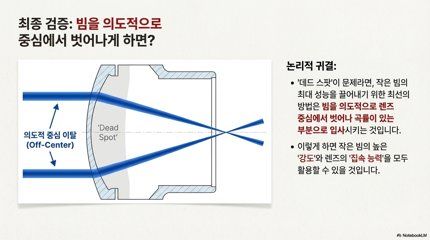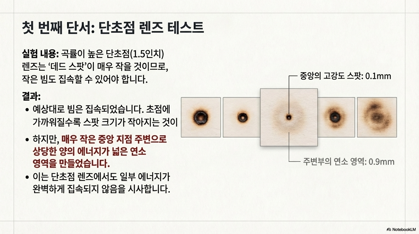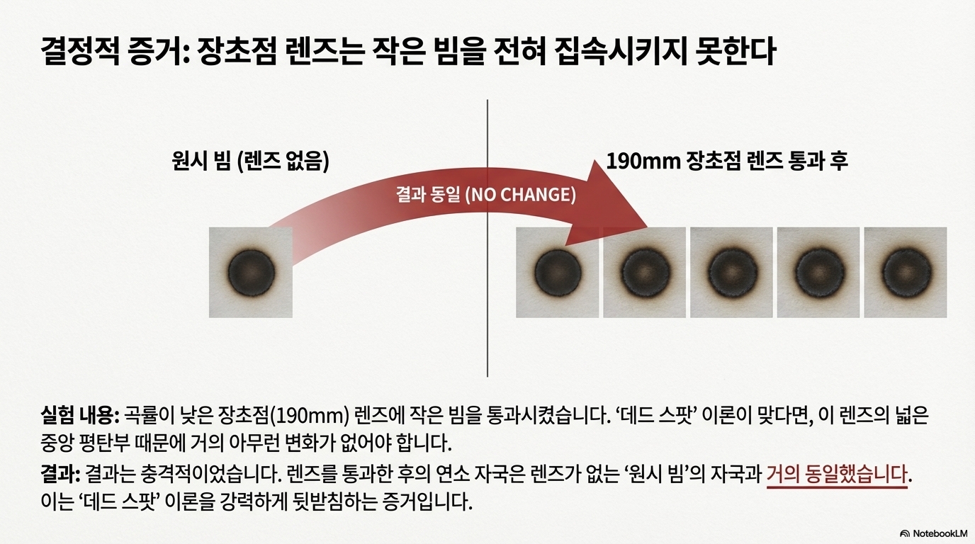 이 결과는 '데드 스팟' 이론을 강력하게 뒷받침하는 증거가 되었습니다. 빔이 커지면서 에너지의 더 많은 부분이 렌즈 중심의 평평한 '데드 스팟'을 벗어나 실제 곡률이 있는 주변부로 퍼져나갔고, 비로소 정상적으로 굴절되어 초점을 맺을 수 있었던 것입니다. "작고 강한 빔이 최고"라는 생각에 대한 완벽한 반전이었습니다.