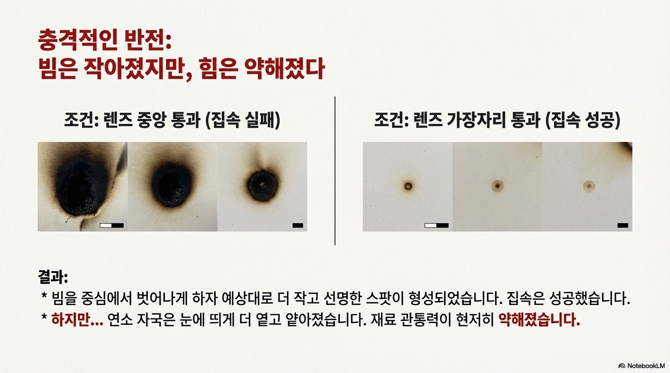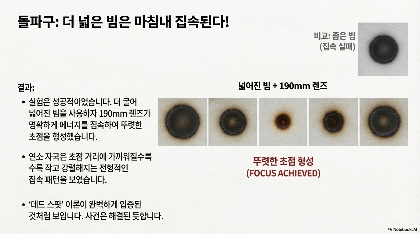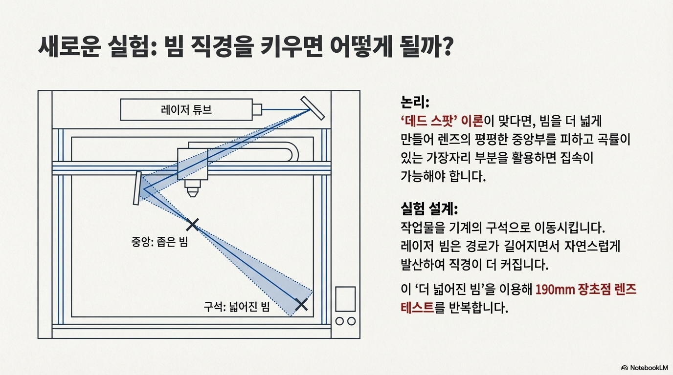 '데드 스팟' 가설이 사실이라면, 빔을 의도적으로 넓혀 중심의 '죽은 지점'을 피하게 만들면 렌즈가 다시 작동해야 합니다. 실험자는 바로 그 가설을 검증하기 위해 기계의 구석으로 빔을 이동시켜 의도적으로 빔의 직경을 넓혔습니다. 그러자 놀라운 일이 벌어졌습니다. 이 '더 커진' 빔은 이전에는 집속에 실패했던 바로 그 190mm 장초점 렌즈에서 초점을 형성하기 시작한 것입니다. 실험자는 말문이 막힐 정도였습니다. 예측했던 결과가 눈앞에 펼쳐졌기 때문입니다.