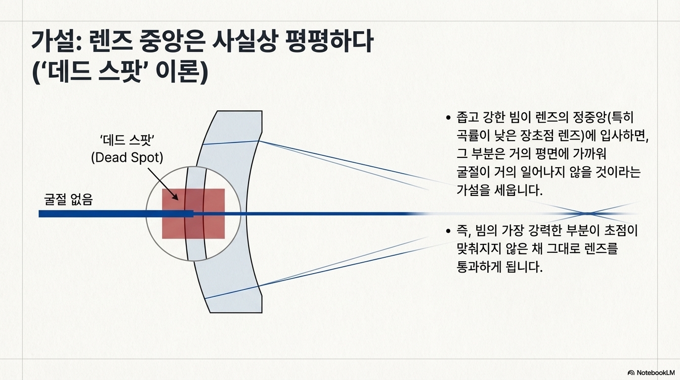 이해할 수 없는 현상에 직면한 실험자는 대담한 가설을 세웁니다. 바로 렌즈 중심의 '데드 스팟(Dead Spot)' 이론입니다. 그에 따르면, 특히 곡률이 완만한 장초점 렌즈의 중심부는 확대해서 보면 사실상 평면에 가깝습니다. 만약 매우 좁은 고강도 빔이 정확히 이 평평한 중심 영역으로 들어오면, 빔은 굴절되지 않고(즉, 집속되지 않고) 그대로 직진하게 된다는 것입니다.