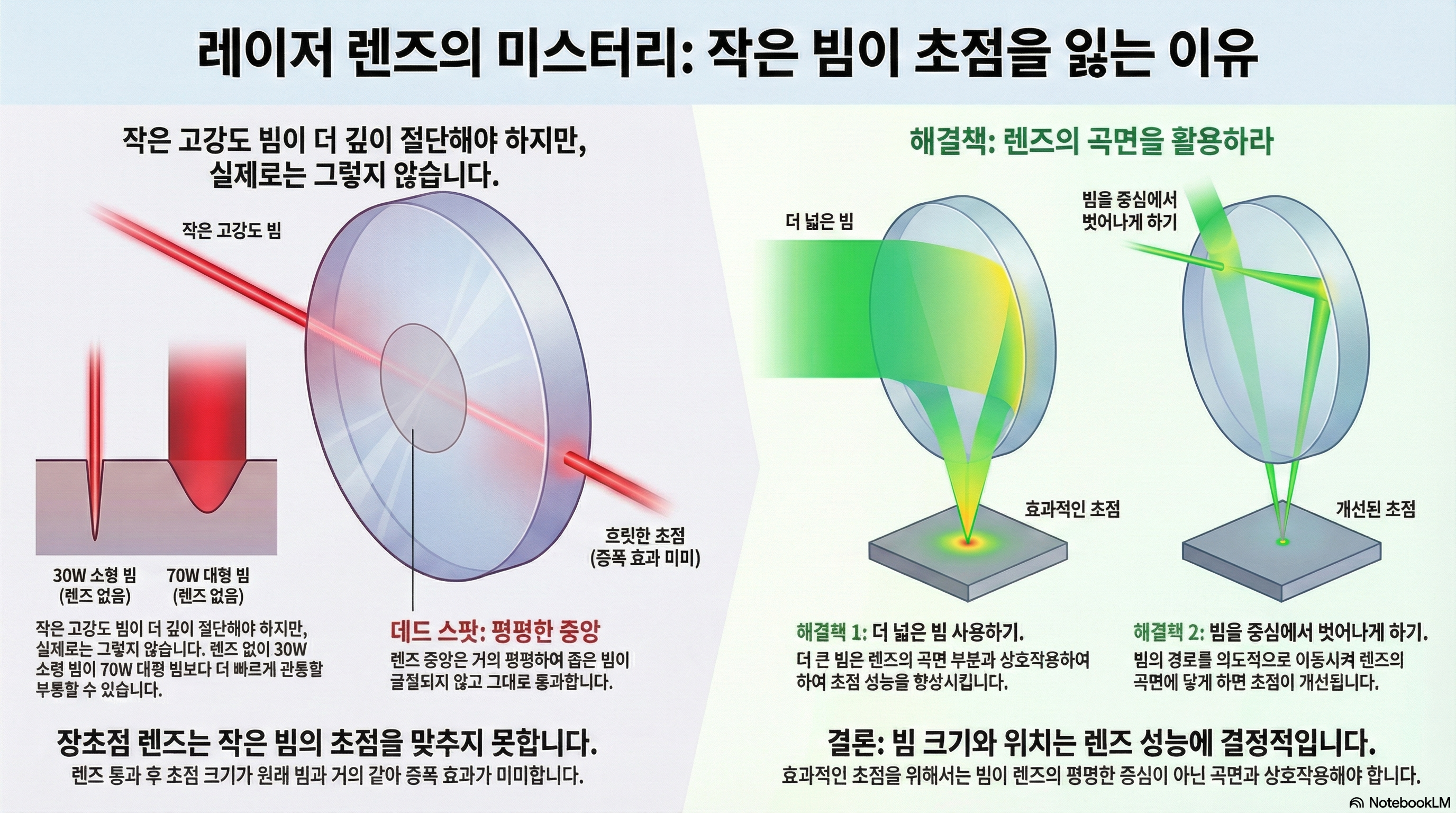 우리 대부분은 렌즈에 대해 간단하고 명확한 상식을 가지고 있습니다. "렌즈는 빛을 한 점으로 모아 더 강력하게 만드는 도구"라는 것이죠. 초등학교 과학 시간부터 우리는 돋보기로 햇빛을 모아 종이를 태우는 실험을 통해 이 원리를 몸소 체험했습니다. 당연히 고출력 레이저 가공의 세계에서도 이 원리는 황금률처럼 여겨졌습니다.
