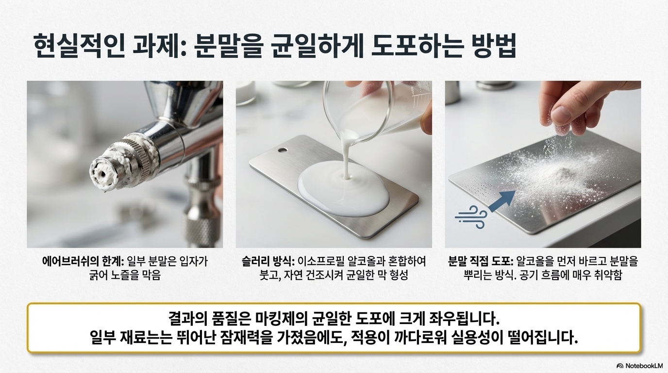 - 액체 도포: 에어브러시 사용이 어려운 재료들은 이소프로필 알코올과 섞어 액체 상태로 만든 뒤 표면에 직접 붓는 방식이 더 나은 대안이었습니다. 알코올이 증발하면서 재료가 표면에 고르게 남게 됩니다.