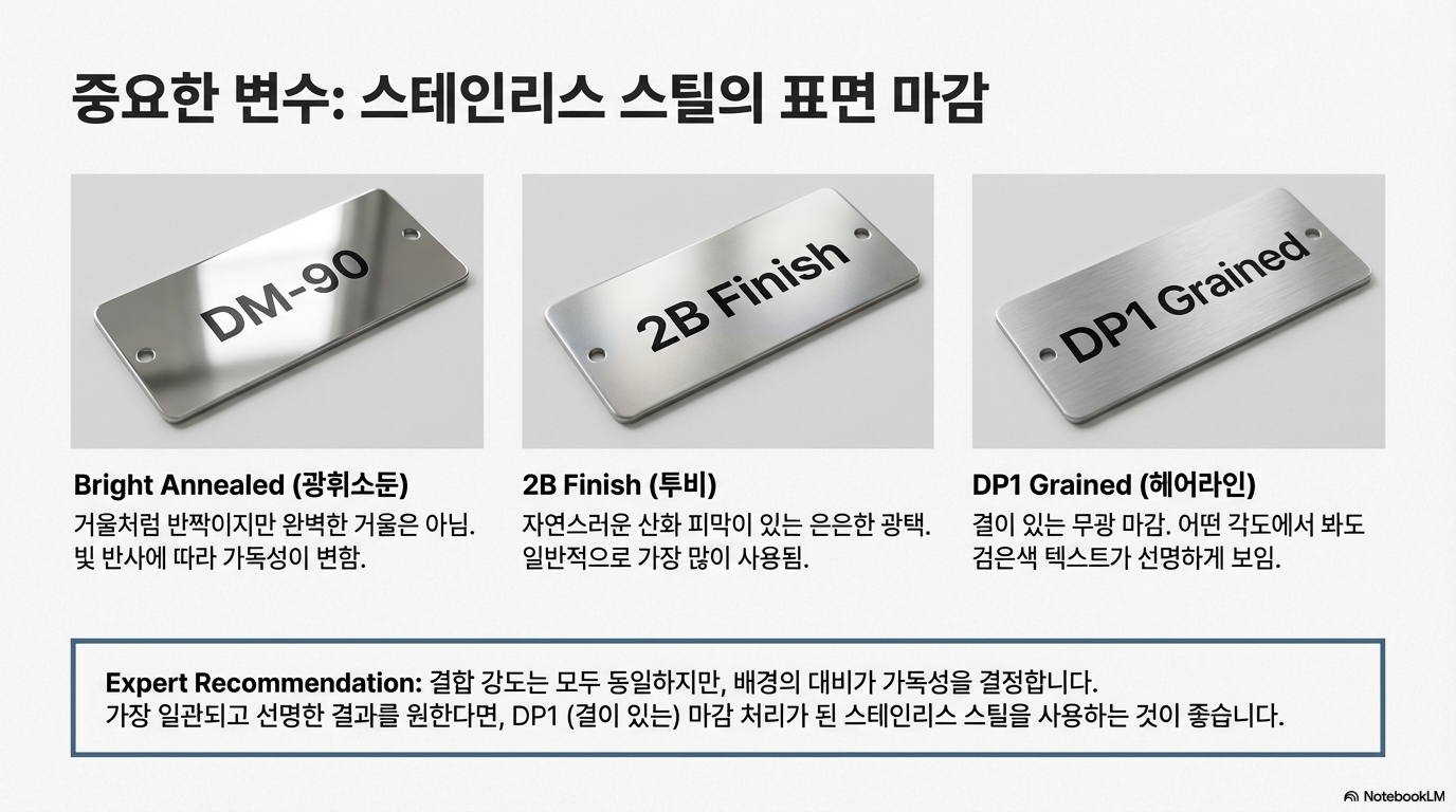 하지만 여기서 한 가지 결정적인 변수가 발견되었습니다. 바로 스테인리스 스틸 표면의 마감 처리 방식입니다. 동일한 DM90 마킹을 세 가지 다른 마감재에 테스트한 결과는 놀라웠습니다.