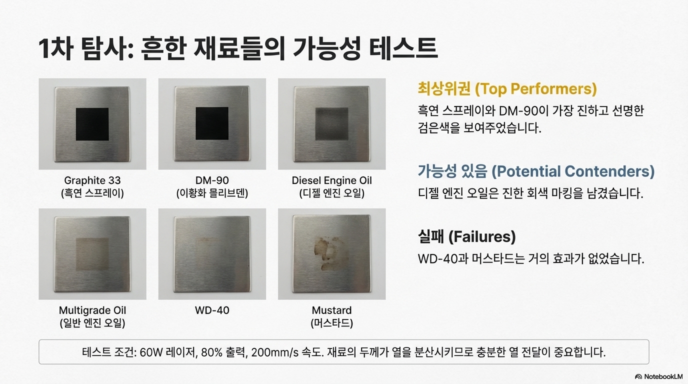 실험에 사용된 재료 중 가장 예상 밖의 결과를 보여준 것은 바로 '디젤 엔진 오일'이었습니다. 상식적으로 오일에 레이저 열을 가하면 그저 타버릴 것이라고 생각하기 쉽습니다. 하지만 놀랍게도 엔진 오일은 불이 붙지 않았을 뿐만 아니라, 영구적인 마킹을 남겼습니다.