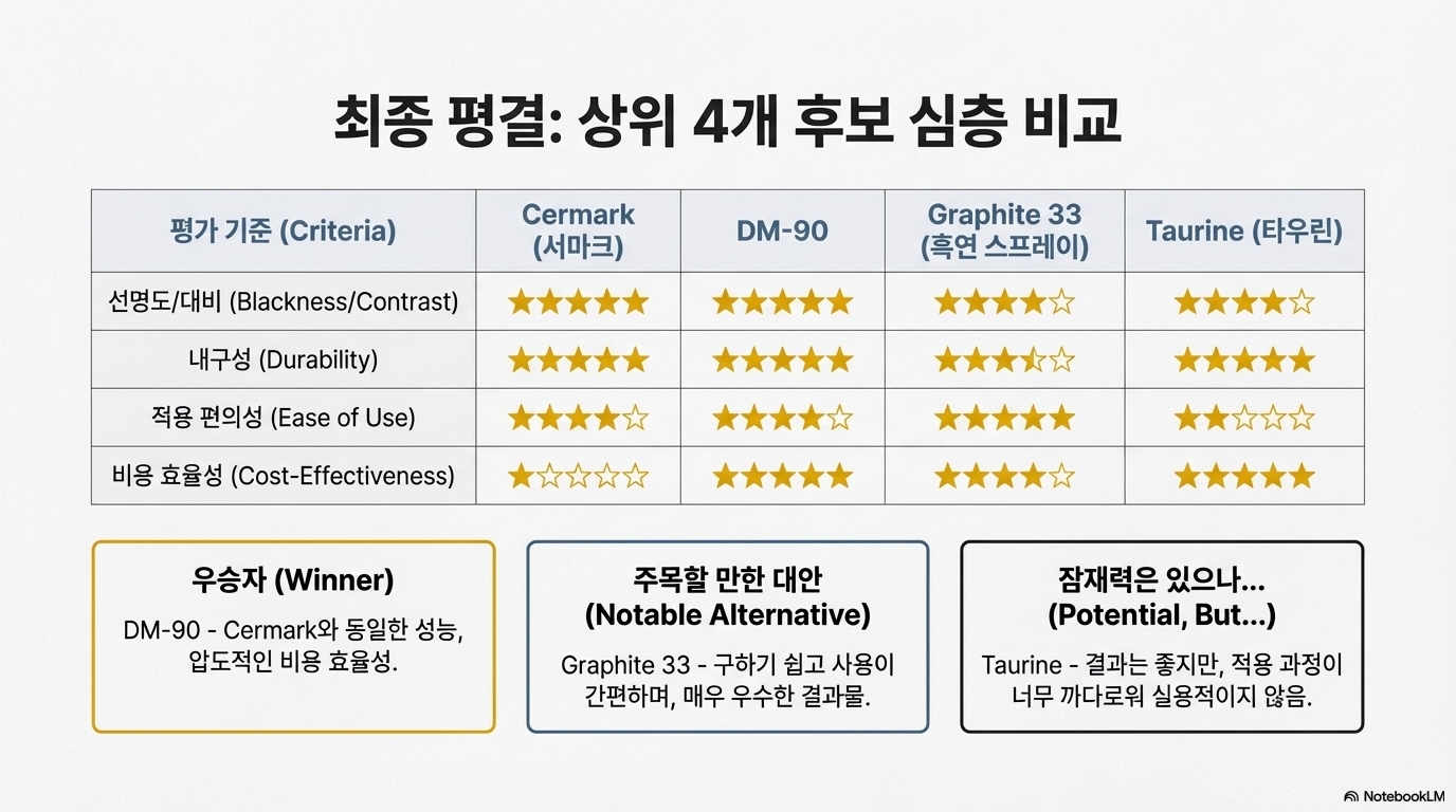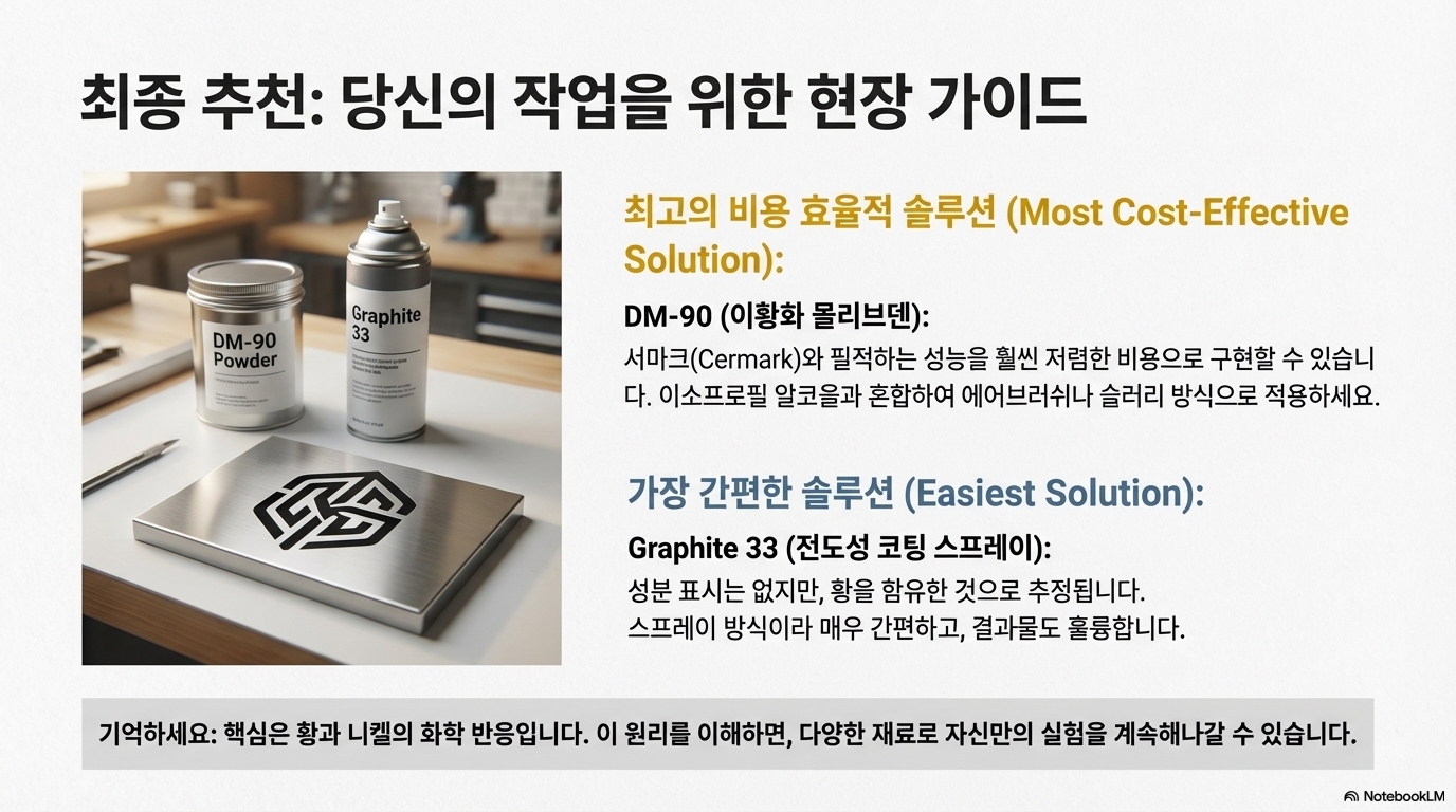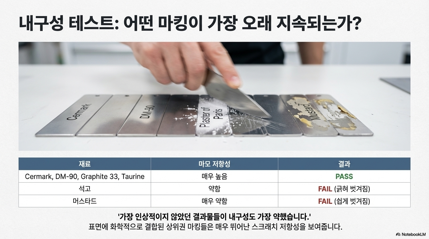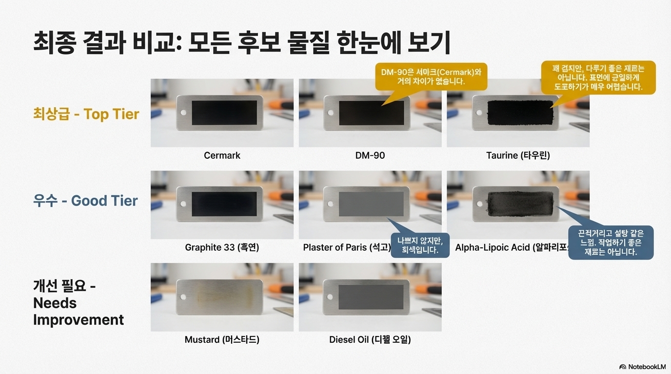 이번 실험이 내린 가장 실용적인 결론 중 하나는 '가장 비싼 제품이 항상 최고의 선택은 아니다'라는 것입니다. 업계 표준으로 알려진 고가의 '서마크(Cermark)'와 그보다 훨씬 저렴한 이황화 몰리브덴 기반의 'DM90'을 나란히 테스트한 결과, 두 마킹의 품질은 육안으로 거의 구별하기 어려울 정도로 동일했습니다. 또한, '그래파이트 33(Graphite 33)'이라는 전도성 코팅 스프레이 역시 이들과 견줄 만한 훌륭한 대안임이 확인되었습니다. 이 세 가지 재료는 모두 선명한 검은색 마킹을 남겼으며, 스테인리스 스틸 조각으로 긁어내는 내구성 테스트에서도 뛰어난 저항력을 보여주었습니다.