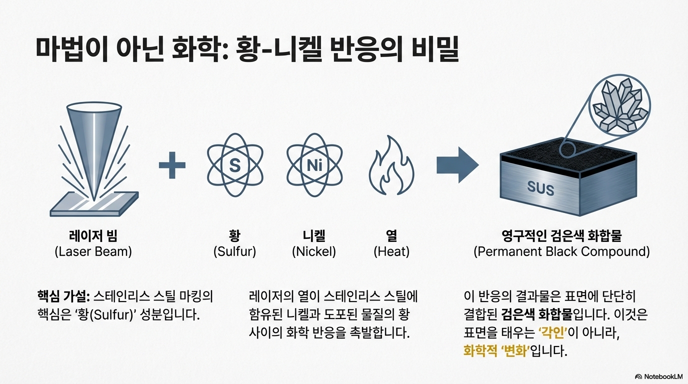 이 모든 실험의 중심에는 한 가지 강력한 가설이 자리 잡고 있습니다. 바로 스테인리스 스틸에 영구적인 검은색 마킹을 가능하게 하는 핵심 성분이 '유황(Sulfur)'이라는 것입니다. 레이저가 가하는 높은 열은 유황 화합물이 스테인리스 스틸의 주요 성분인 니켈(Nickel)과 반응하도록 촉진합니다. 이 화학 반응의 결과로 표면에는 지워지지 않는 견고한 검은색 층이 형성됩니다. 이 반응을 위해서는 두꺼운 금속에 충분한 열을 전달해야 하므로, 실험은 주로 60~70W 레이저의 최대 출력과 100-200mm/s의 속도로 진행되었습니다.