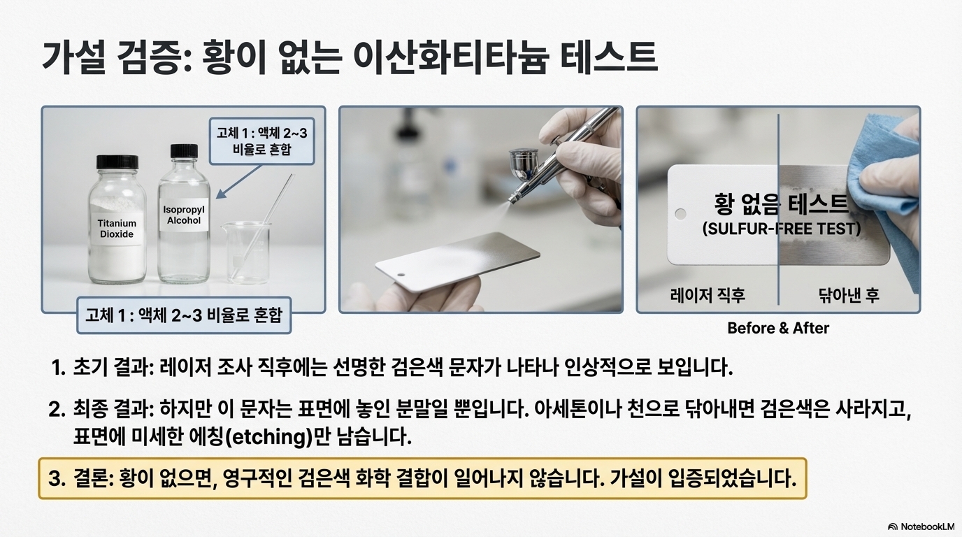 이 가설을 증명하기 위해 유황이 포함되지 않은 '이산화티타늄(Titanium Dioxide)'으로 실험을 진행했습니다. 이산화티타늄을 도포하고 레이저를 쏘았을 때, 처음에는 매우 선명한 검은색 글자가 나타났습니다. 하지만 아세톤으로 닦아내자 검은색은 온데간데없이 사라지고, 표면에는 '다양한 수준의 거칠기'를 지닌 식각 자국만 남았습니다. 이는 유황 없이는 영구적인 화학적 결합이 일어나지 않는다는 사실을 명확히 보여줍니다. 즉, 이 과정은 재료를 깎아내는 것이 아니라 표면의 성질 자체를 바꾸는 것입니다.