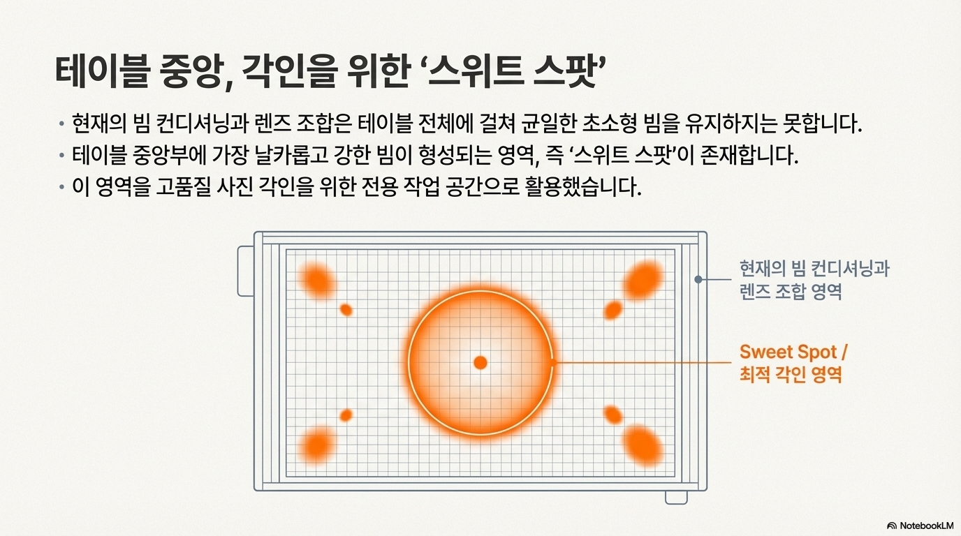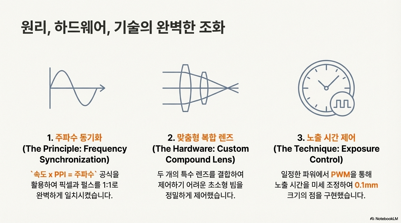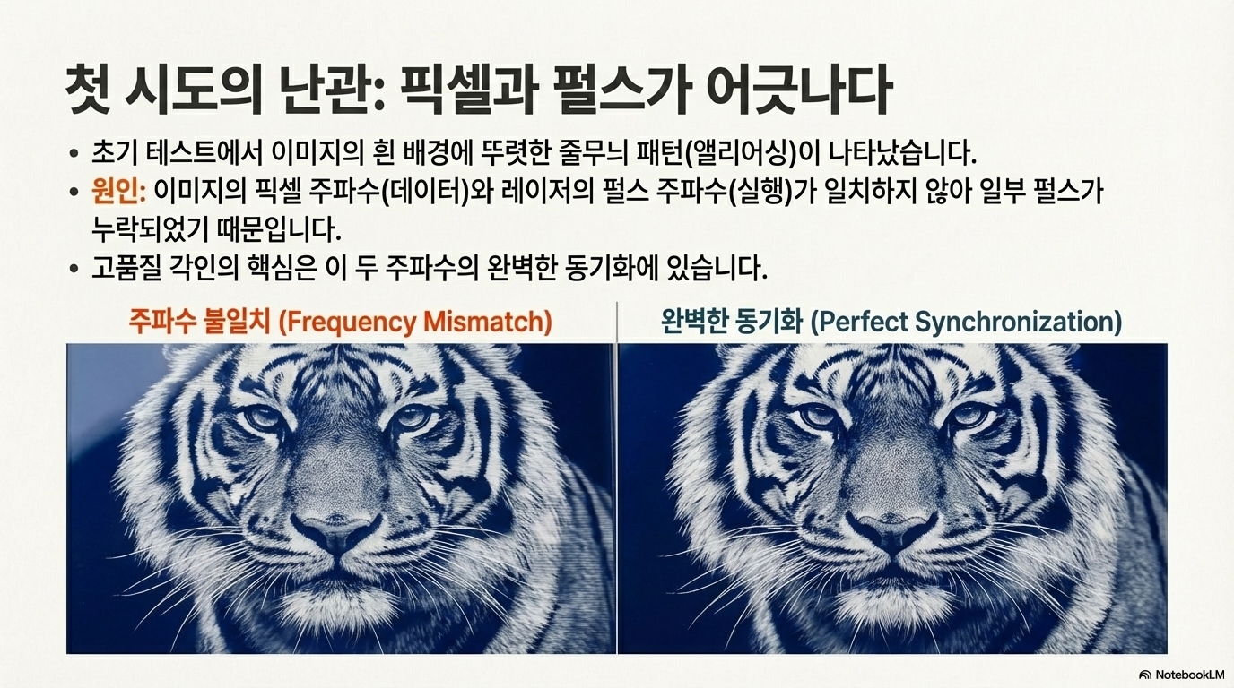 이 문제를 해결하기 위해 수차례 실험을 거듭했고, 마침내 마법의 숫자 11.7kHz를 찾아냈습니다. 이 주파수에서 레이저 펄스는 이미지의 픽셀 간격과 완벽하게 동기화되었고, 마침내 밴딩 현상이 사라진 완벽한 품질의 결과물을 얻을 수 있었습니다.