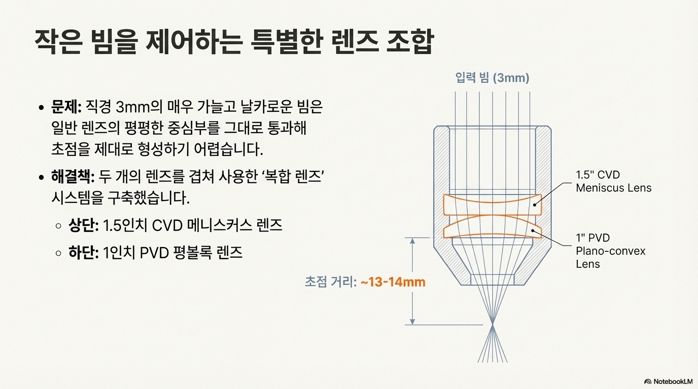 그렇다면 왜 이 조합이 효과적이었을까요? 그 비밀은 약 3mm 직경의 매우 좁은 빔이 렌즈의 중심축, 즉 굴절이 거의 없는 평평한 지점을 통과하는 데 있습니다. 덕분에 빔은 그 날카로운 고강도 프로파일을 거의 그대로 유지한 채 통과하여, 사진 조각에는 이상적인 극도로 작고 정밀한 점을 만들어낼 수 있었습니다.