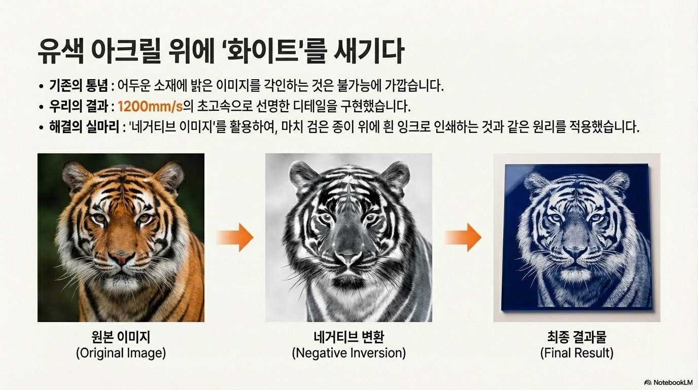 발견 1: 불가능해 보였던 '컬러 아크릴에 흰색 새기기'가 현실로