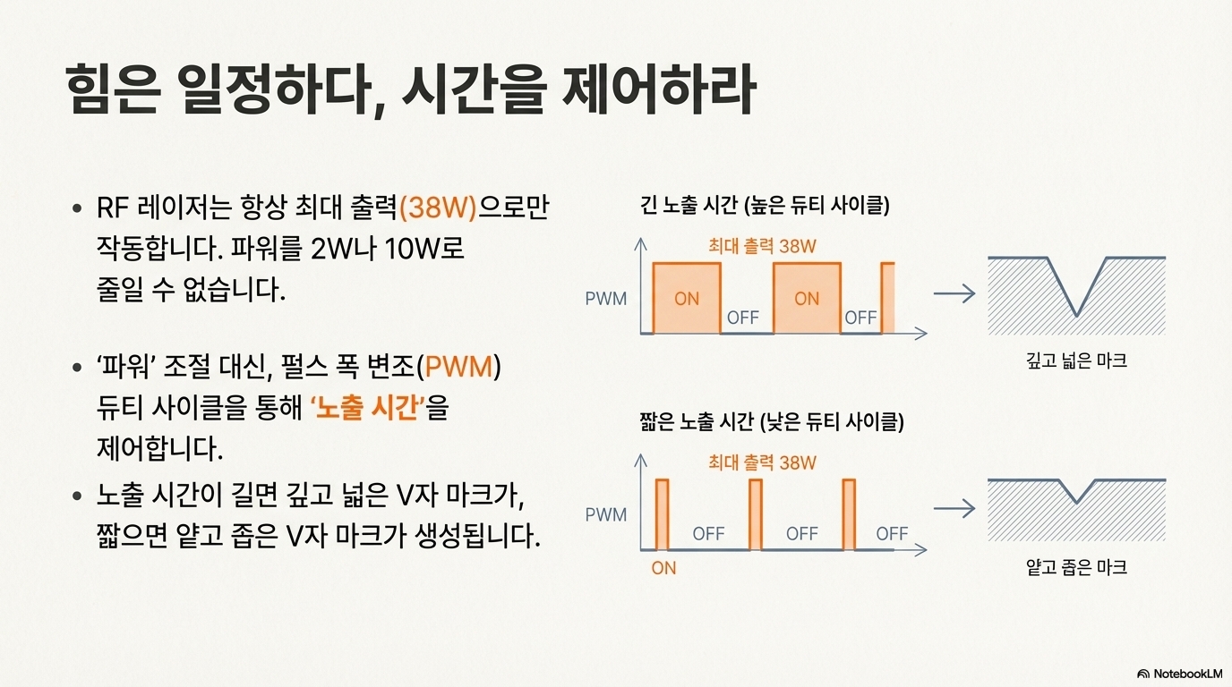 즉, RF 레이저는 출력 자체를 바꾸는 것이 아니라, 최대 출력의 빔을 얼마나 짧게 끊어서 쏘느냐에 따라 파워의 '효과'를 조절하는 것입니다. 결론적으로, RF 레이저에서는 파워 설정이 곧 점의 크기를 제어하는 핵심 수단이 되는 것입니다.