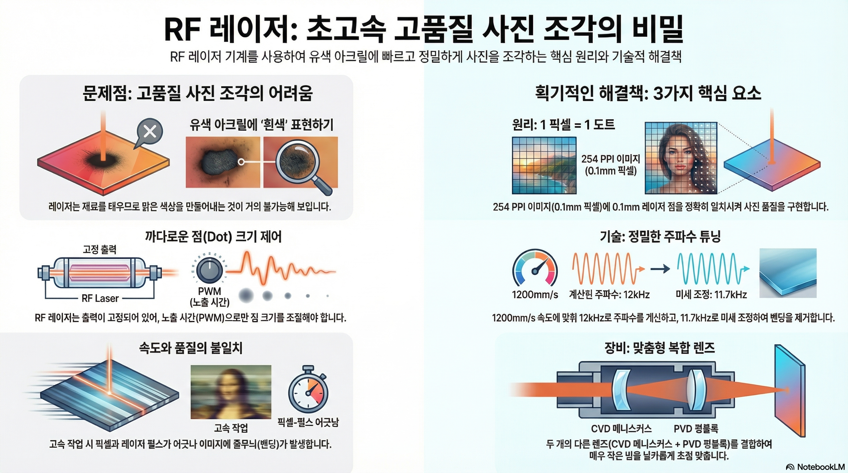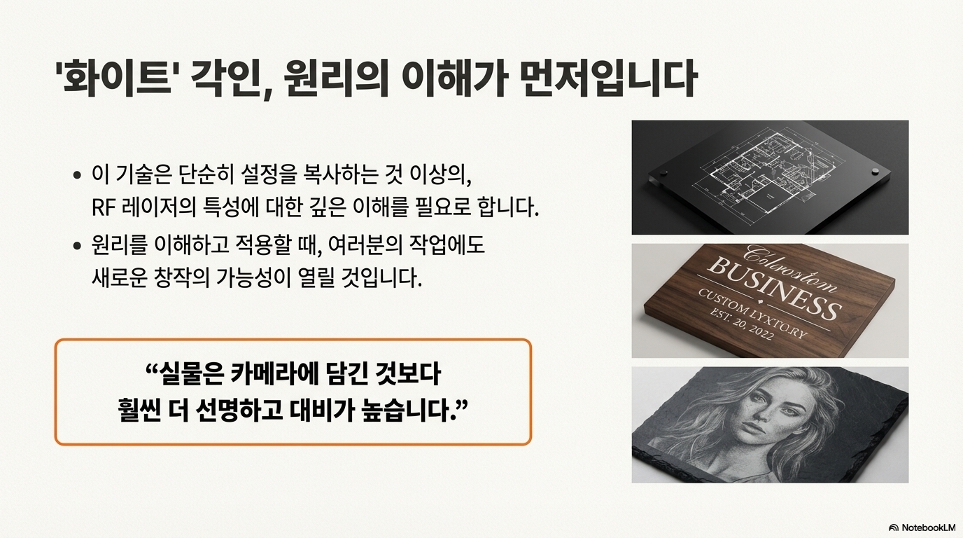 이 기계는 상상 속에서나 가능할 법한 결과물을 만들어냈습니다. 믿을 수 없을 만큼 빠른 속도로 사진을 복제하고, 심지어 유색 아크릴 위에 선명한 흰색을 새겨 넣는 데 성공했죠. 오늘은 이 놀라운 발견의 여정과 그 과정에서 알게 된 RF 레이저의 4가지 비밀을 여러분과 공유하고자 합니다.