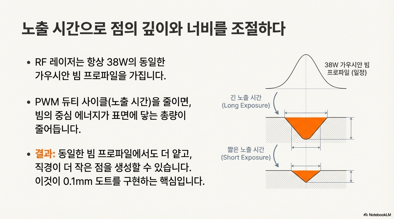 - 짧은 노출 시간: 레이저 빔이 아주 잠깐만 머물며 얕고 좁은 'V'자 모양의 흔적을 남겨 더 작은 점을 만듭니다.
