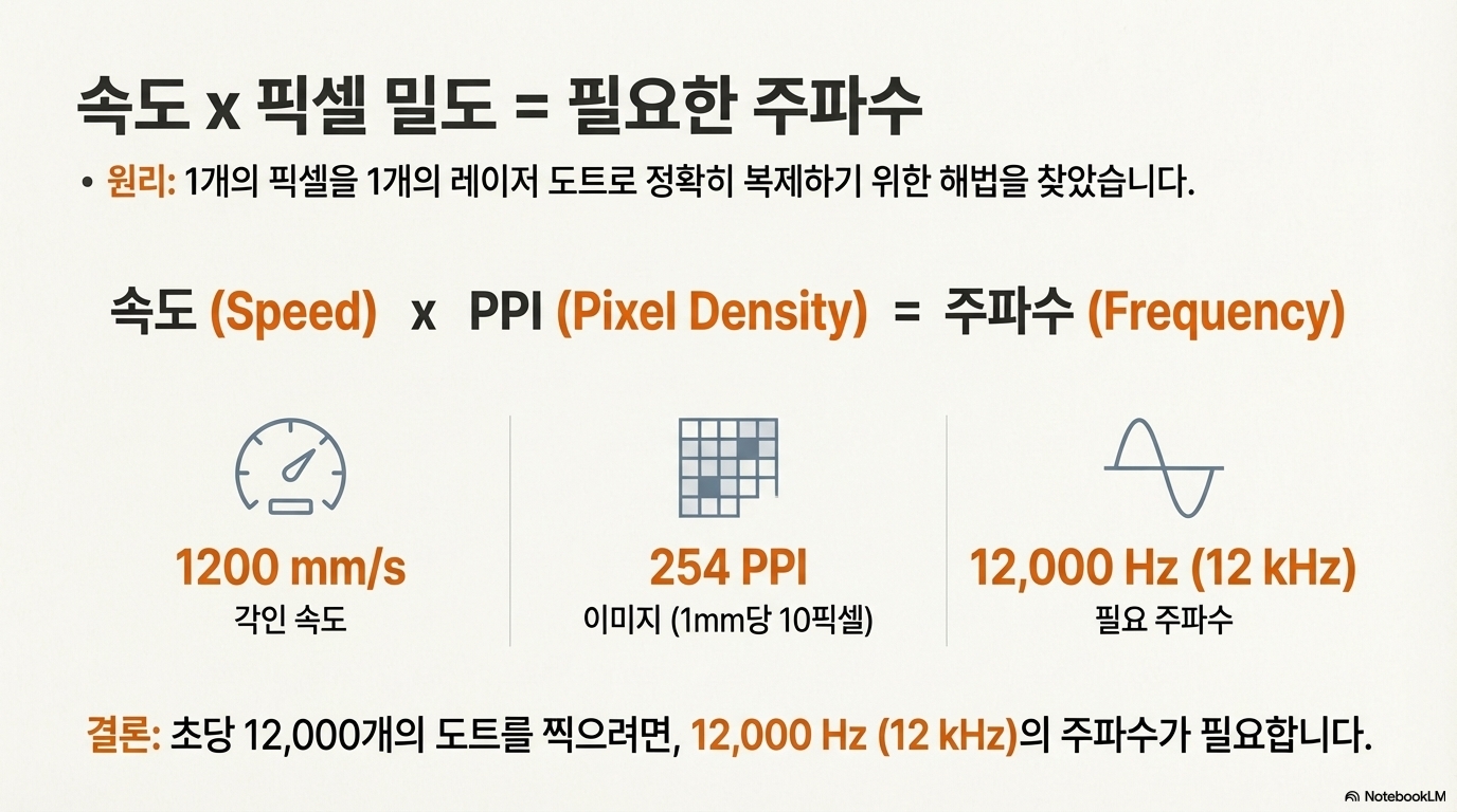 - 필요한 펄스 수: 1200mm/s × 10 pixels/mm = 초당 12,000개의 점(펄스)
