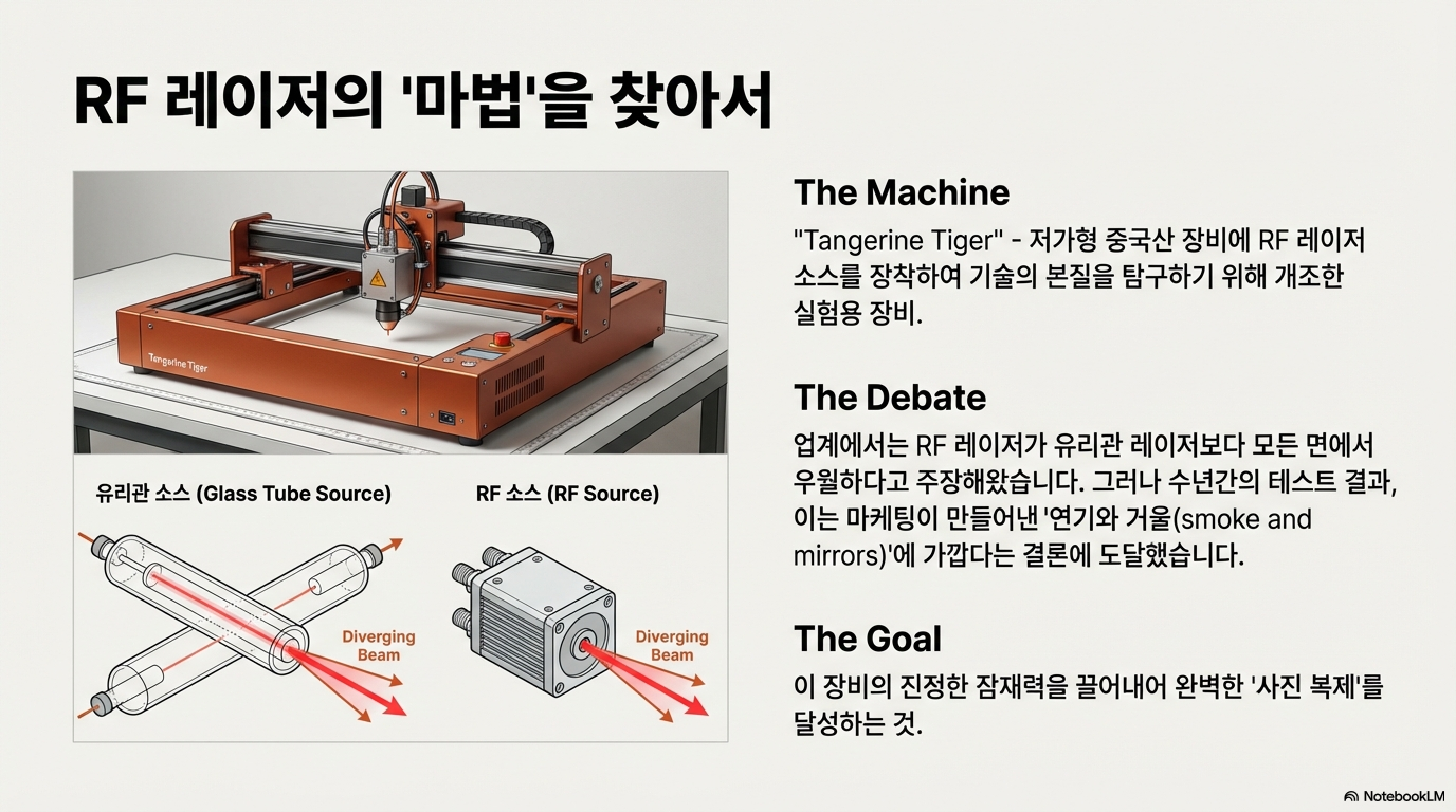 많은 마케팅 자료들은 고가의 RF(Radio Frequency) 레이저 소스가 저렴한 유리관 레이저보다 기술적으로 월등하다고 이야기합니다. 하지만 정말 그럴까요?