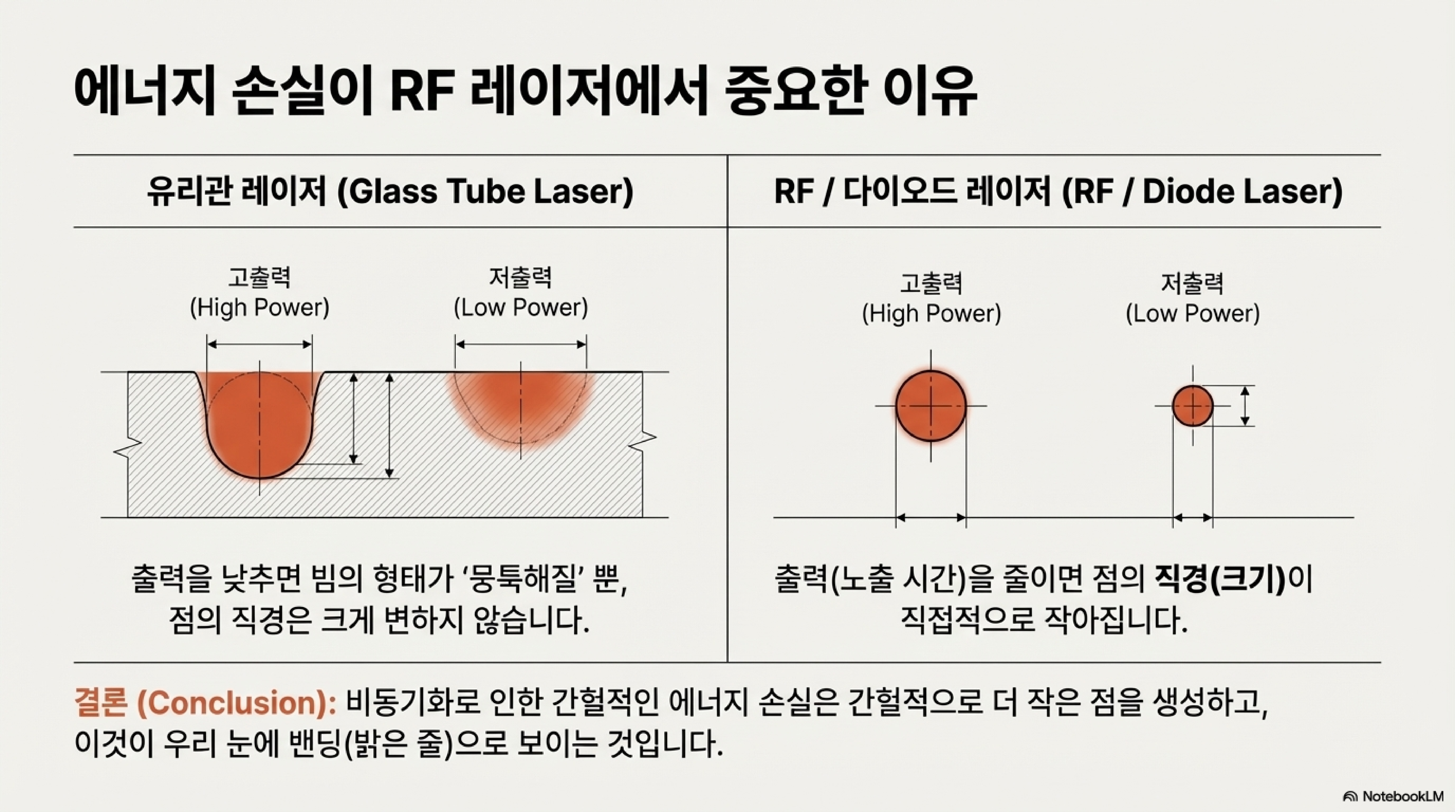 이 방식은 점 크기에 영향을 미치는 방식에서 유리관 레이저와 결정적인 차이를 보입니다.