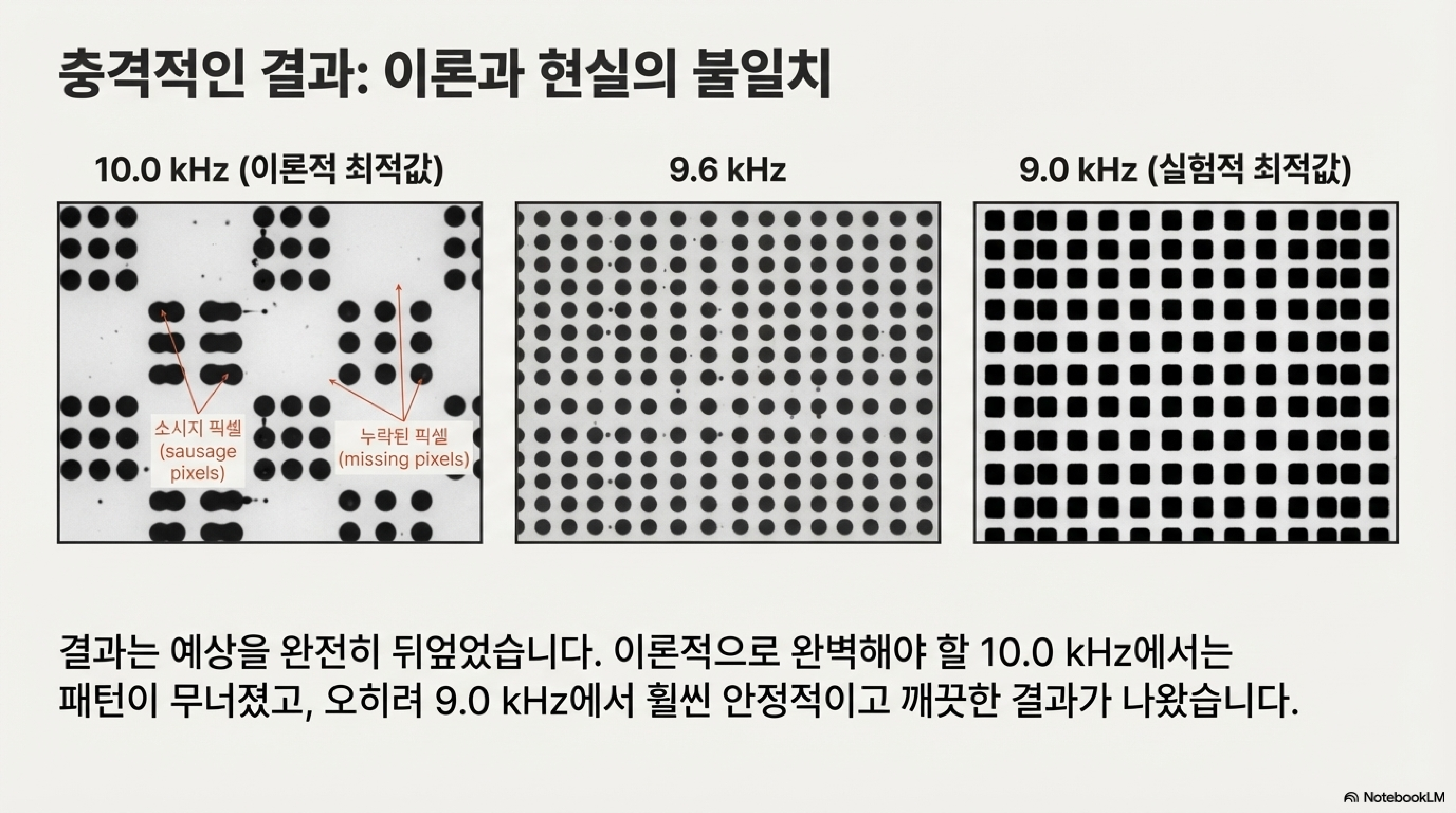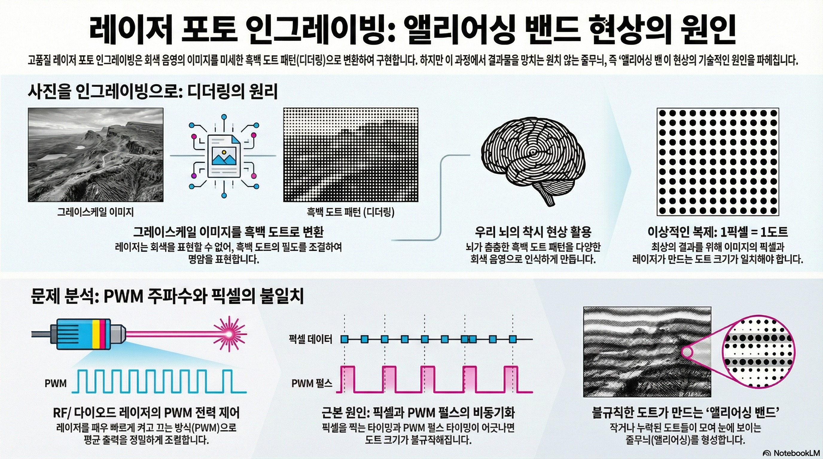 이미지에 나타나는 줄무늬, 즉 밴딩 현상의 진짜 원인은 무엇일까요? 저의 수많은 실험 끝에 내린 결론은 열 문제나 스텝 모터의 부정확성이 아니라, 이미지의 픽셀 데이터와 기계 내부의 PWM 주파수 사이의 '동기화 실패'라는 것이었습니다.