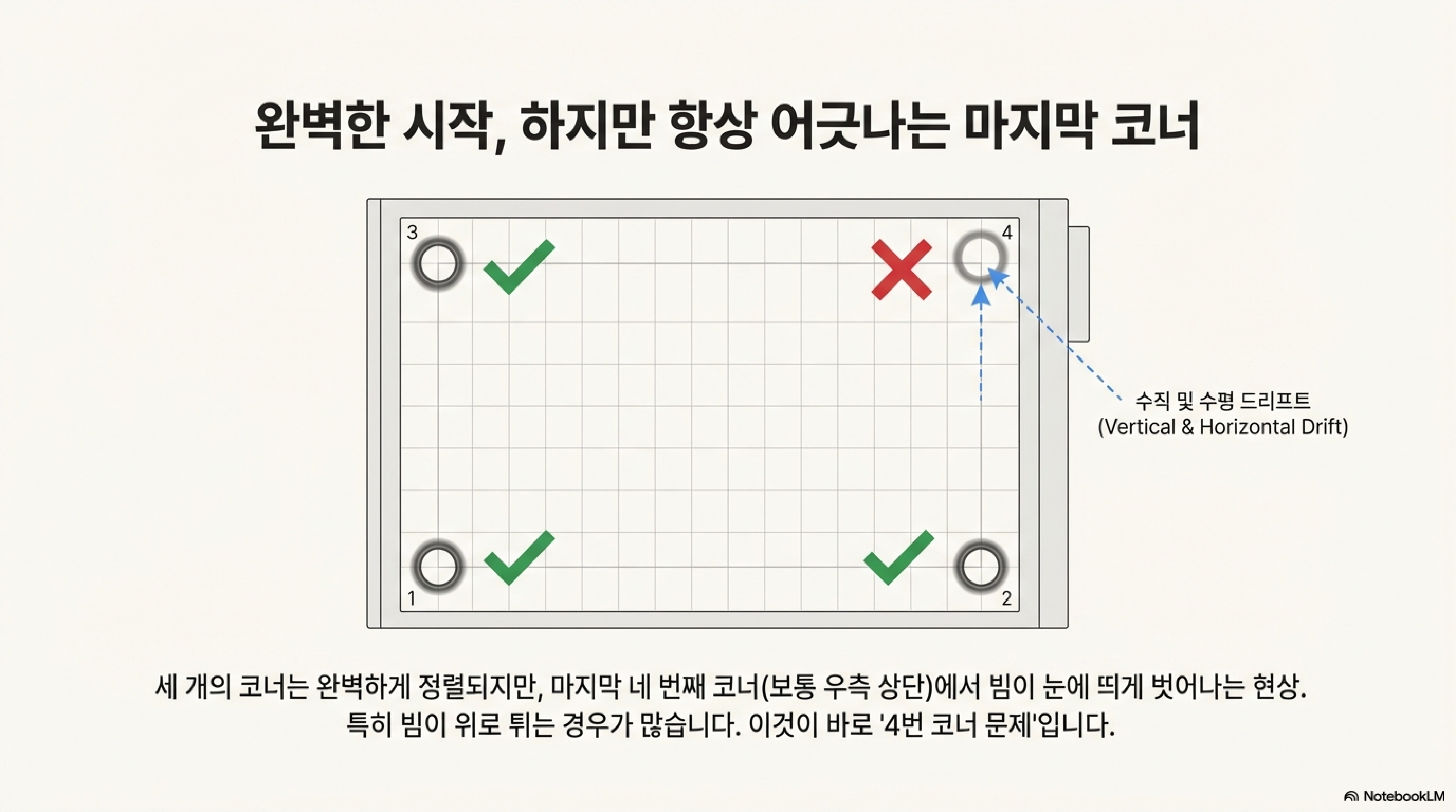 결론적으로, '네 번째 모서리 문제'는 기계적 결함의 신호가 아니라 미세한 정렬 오류가 광학적으로 증폭되어 나타나는 현상입니다. 복잡해 보이는 문제도 올바른 진단과 정확한 절차를 이해하면 의외로 간단하게 해결할 수 있습니다.