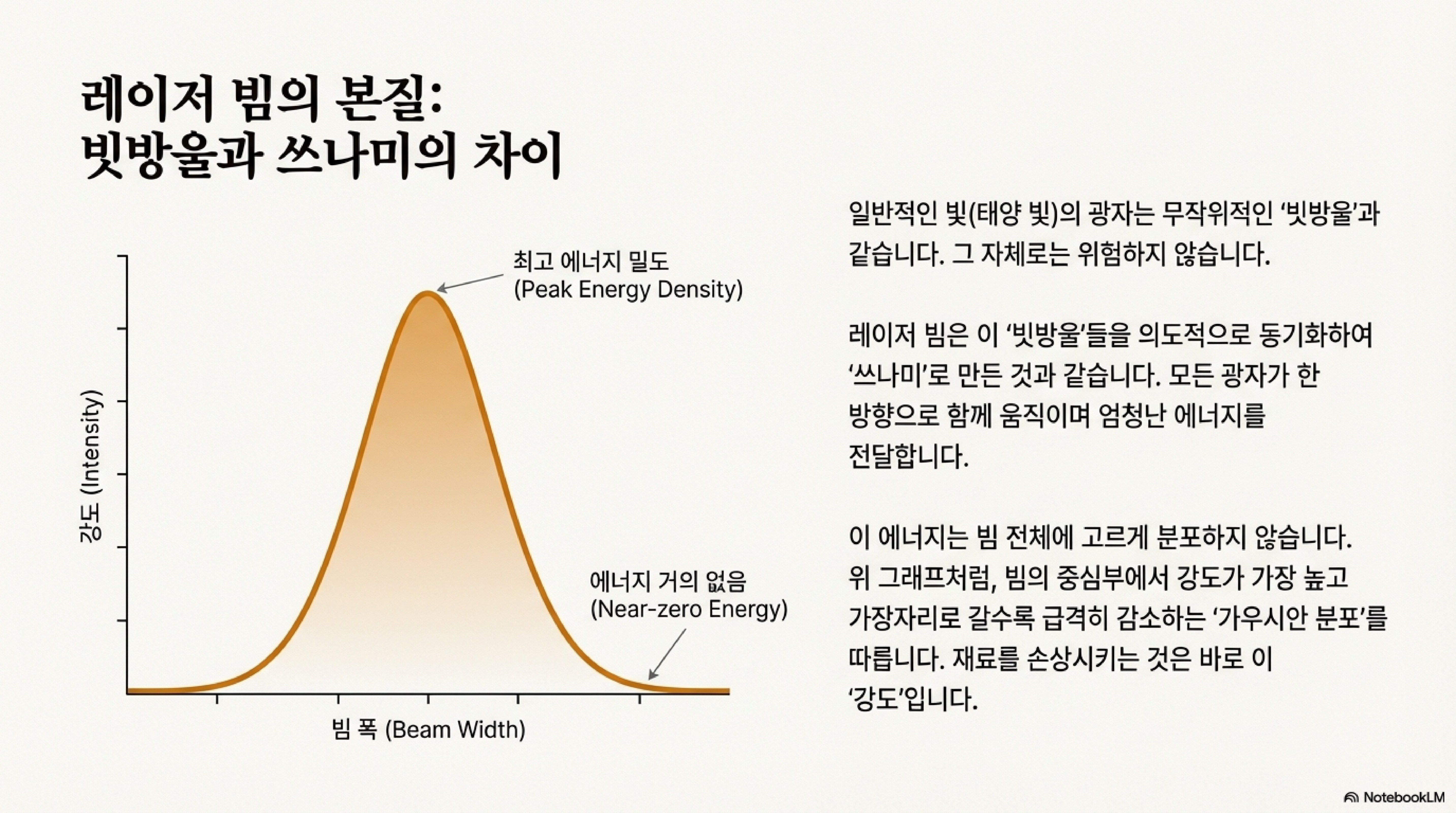 레이저를 제대로 이해하기 위해서는 우리가 직관적으로 알고 있던 고전 광학의 규칙들을 잠시 내려놓아야 합니다. 특히 레이저 빛의 에너지가 중심에 극도로 집중되어 있다는 가우시안 분포의 특성을 아는 것이 모든 것의 출발점입니다.