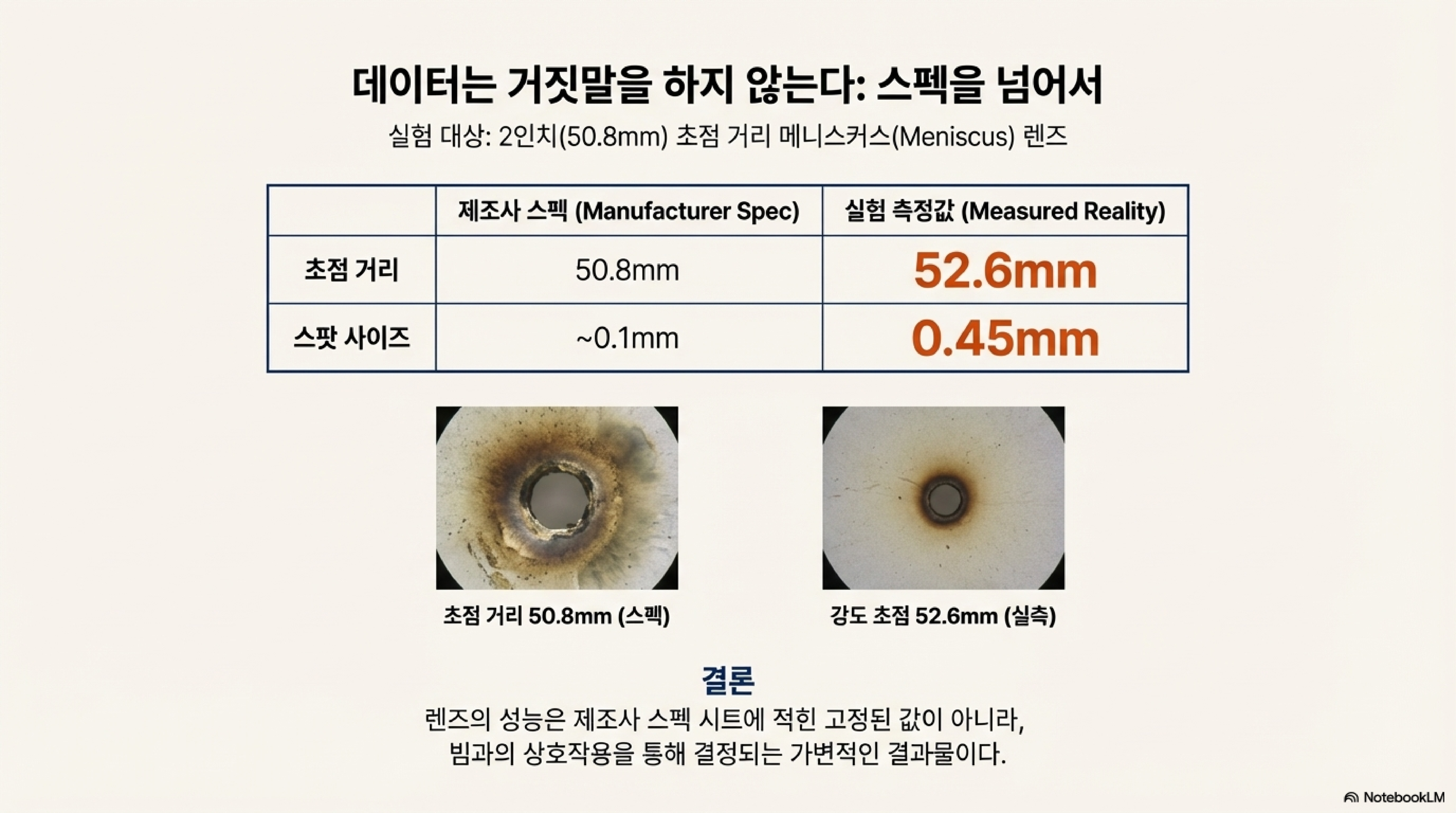 우리는 흔히 렌즈가 만들어내는 '스팟 사이즈'가 고정된 값이라고 생각하지만, 이는 오해입니다. 저의 번 테스트(burn test) 결과는 스팟 사이즈가 정적인 개념이 아니라는 것을 명확히 보여주었습니다.