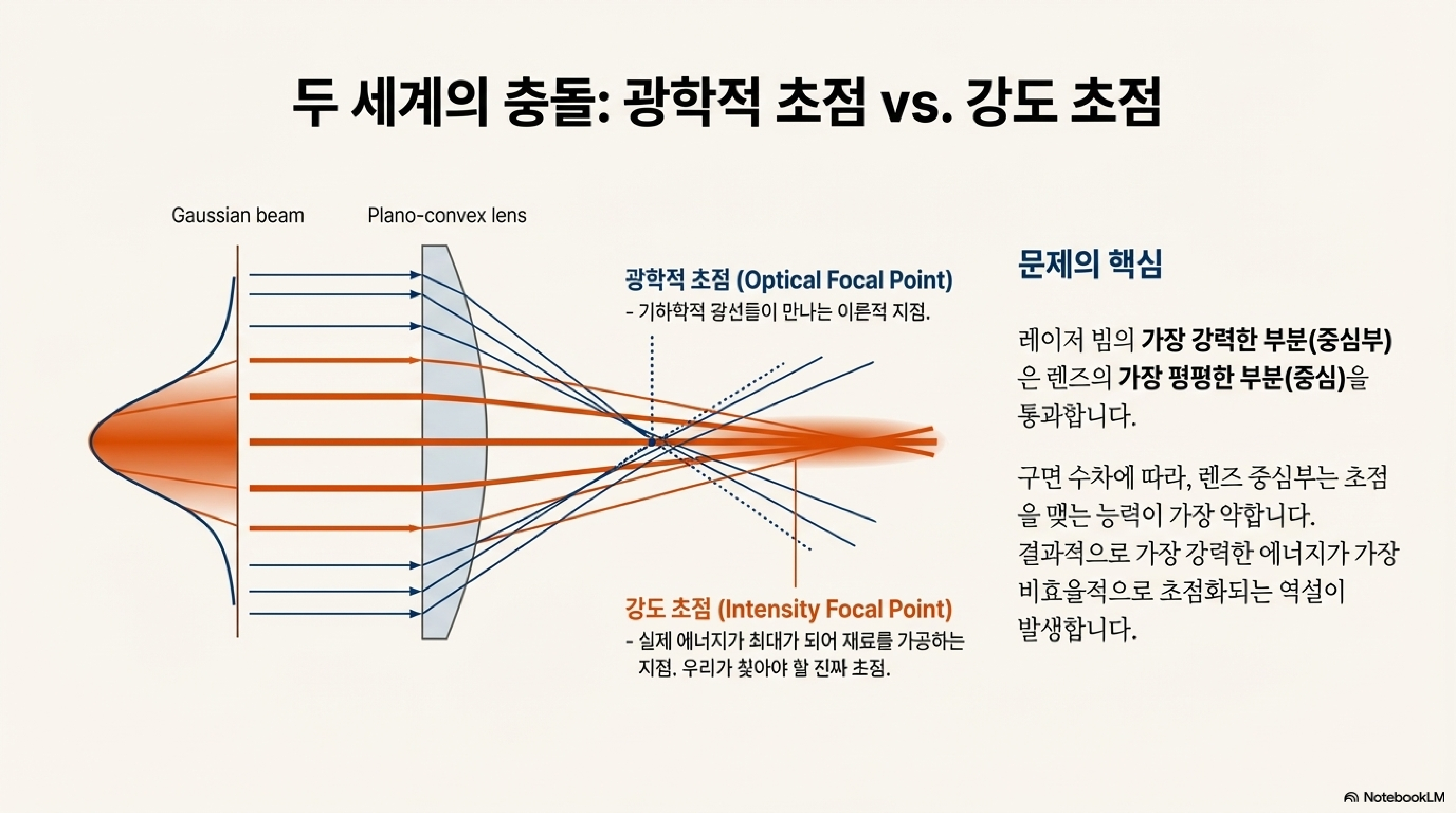 그 이유는 이 고강도 중심부 빔이 구면 렌즈의 표면 중에서 가장 평평한 중앙 부분에 닿기 때문입니다. 이 영역은 곡률이 거의 없기 때문에, 가장 강력한 빛을 거의 굴절시키지 못합니다. 결과적으로, 이 핵심적인 에너지 광선들은 명시된 초점 거리를 훨씬 지나서야 초점을 맺게 되며, 에너지가 분산되어 절단에 효과적으로 기여하지 못합니다. 이는 '씬 빔과 렌즈의 비호환성(the incompatibility of thin beams with lenses)'을 명확히 보여주는 현상입니다. 렌즈가 자신의 가장 강력한 중심 광선을 제대로 집중시키지 못하는 이 명백한 결함은, 완전히 직관에 반하는 해결책으로 저를 이끌었습니다.