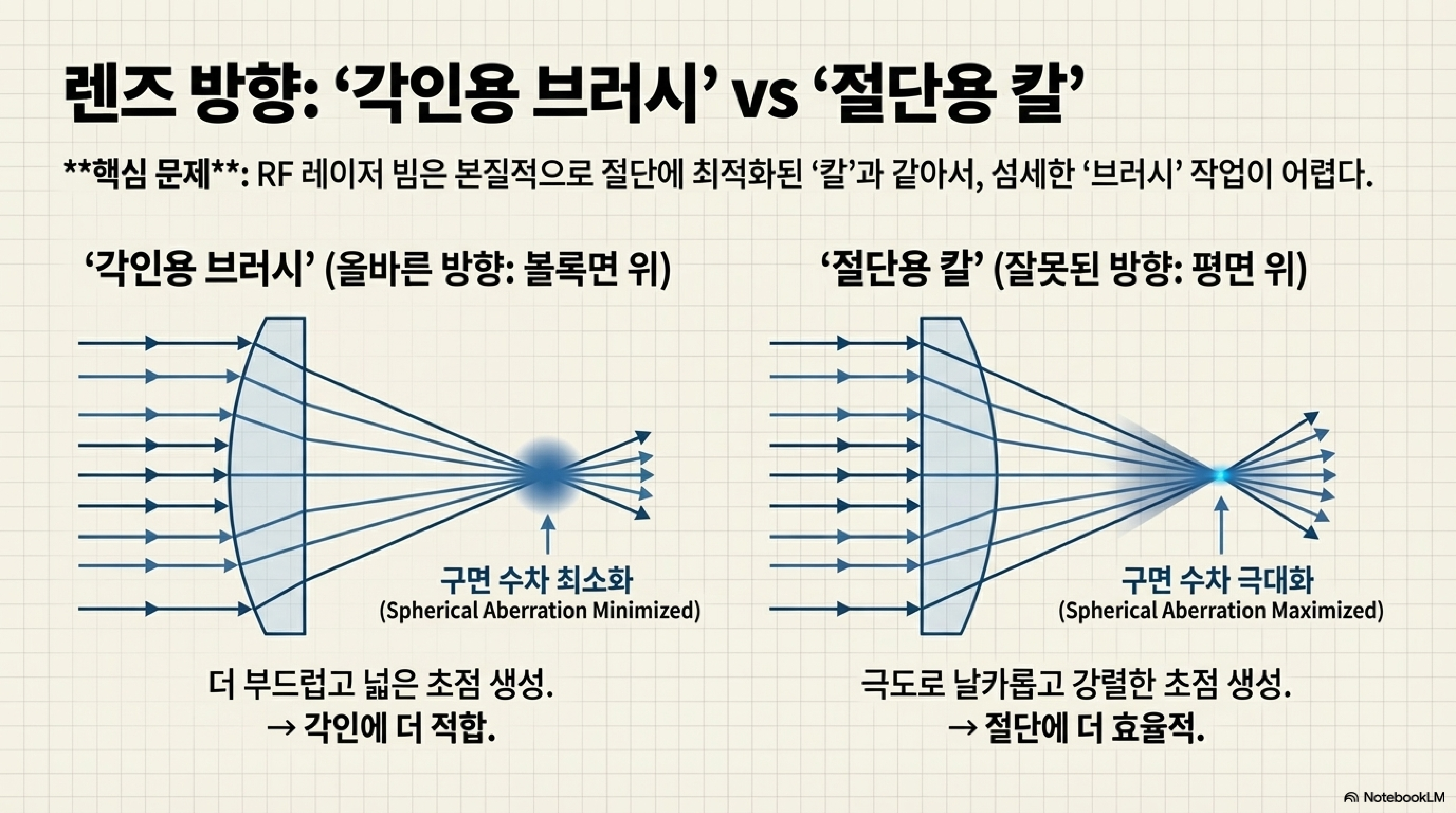 핵심은 이것입니다. 각인에 필요한 속성(선명한 초점, 최소한의 수차)과 절단에 필요한 속성(강렬한 에너지, 높은 수차)은 서로 정반대입니다. 엔지니어들이 제거하려고 애쓰는 렌즈의 '결함'이 사실은 효율적인 절단을 위해 반드시 필요한 요소였던 것입니다.
