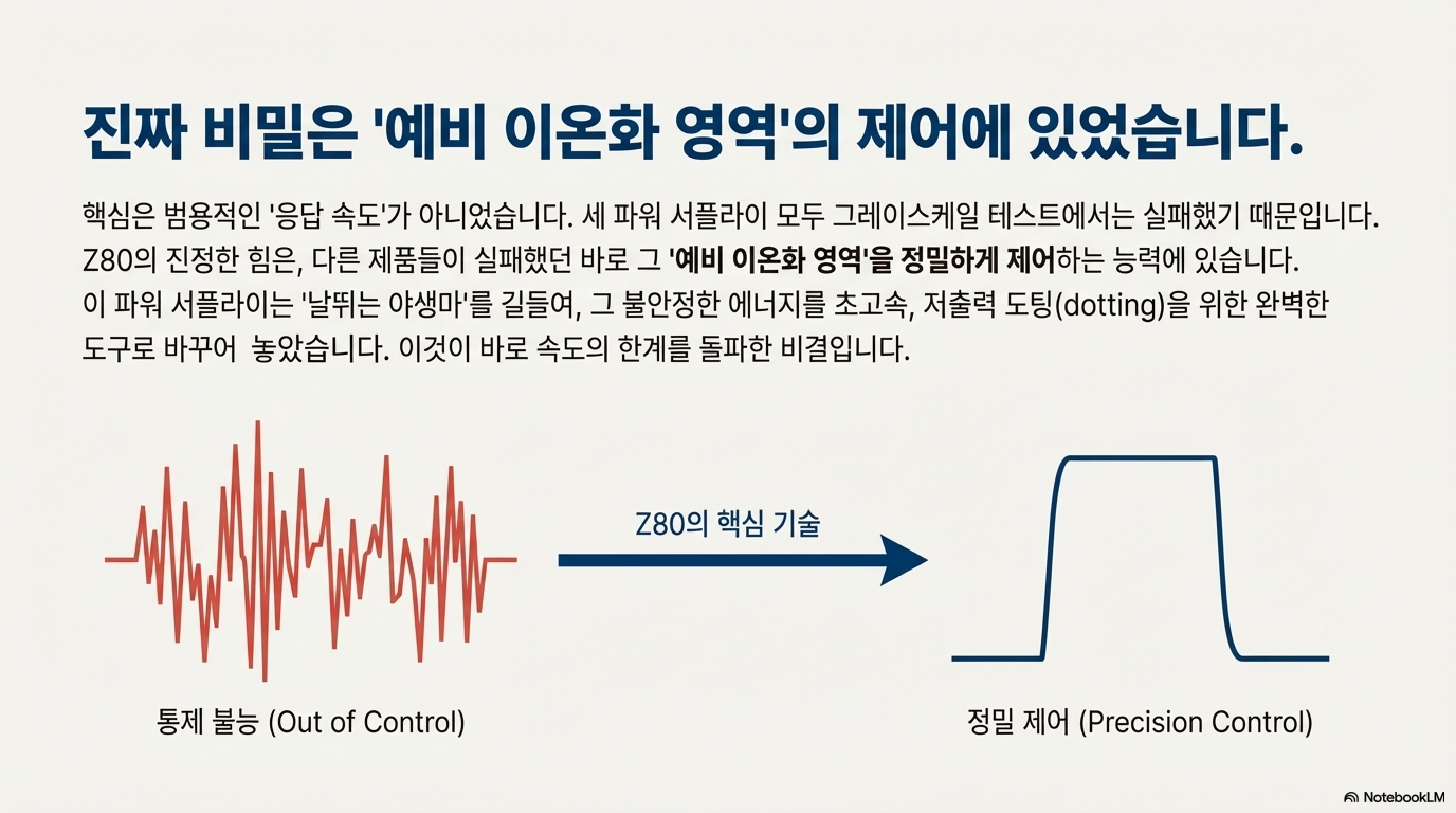 z80 파워 서플라이가 다른 모델(myjg80, T100)보다 뛰어난 진짜 이유는 단순히 최대 속도가 빠르기 때문만이 아니었습니다. 더 깊이 들여다본 결과, 핵심적인 차이는 바로 가장 불안정하고 예측하기 어려운 '사전 이온화 영역'을 얼마나 더 일관되고 정밀하게 제어할 수 있는지에 있었습니다. 즉, '요동치는 야생마'를 얼마나 더 효과적으로 길들이느냐의 문제였습니다.