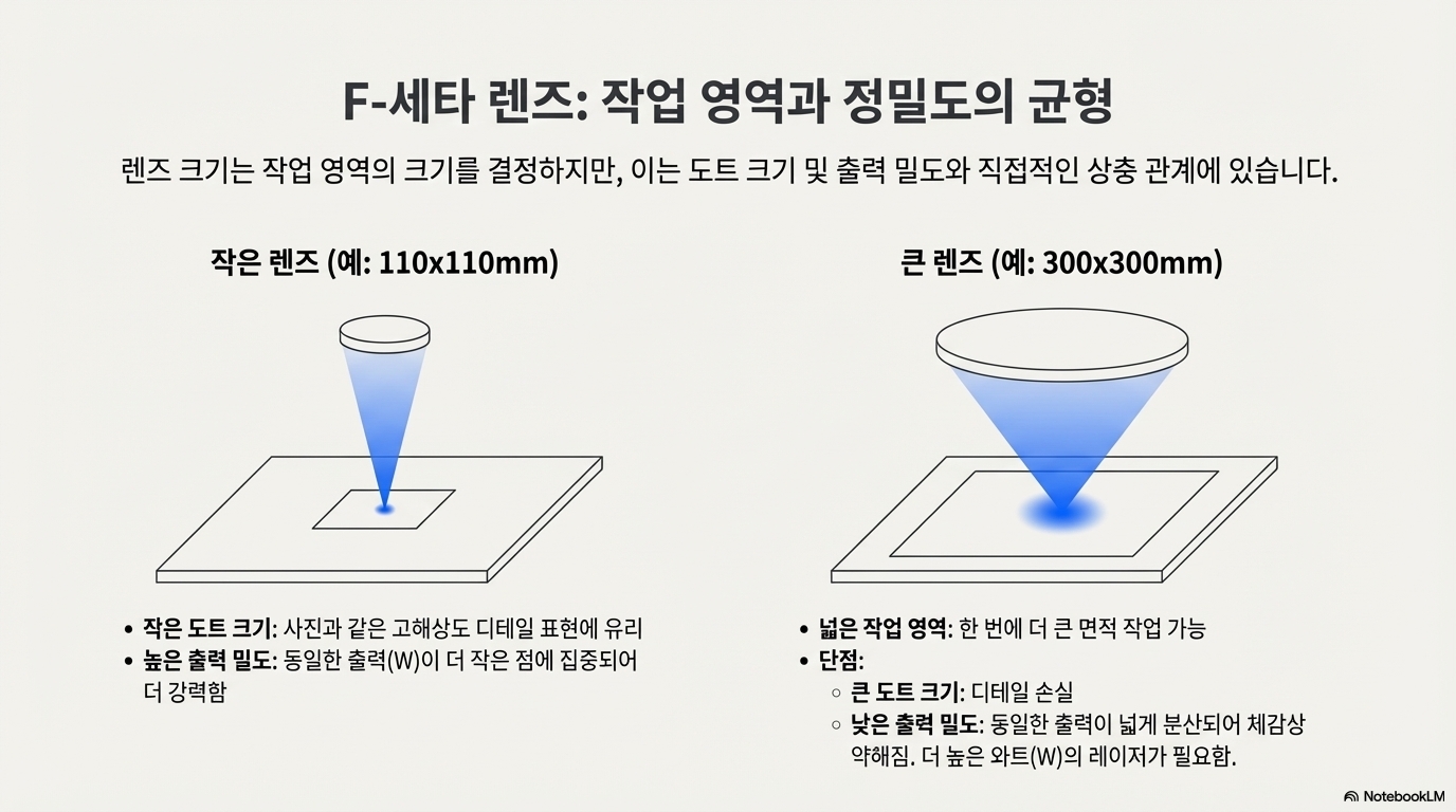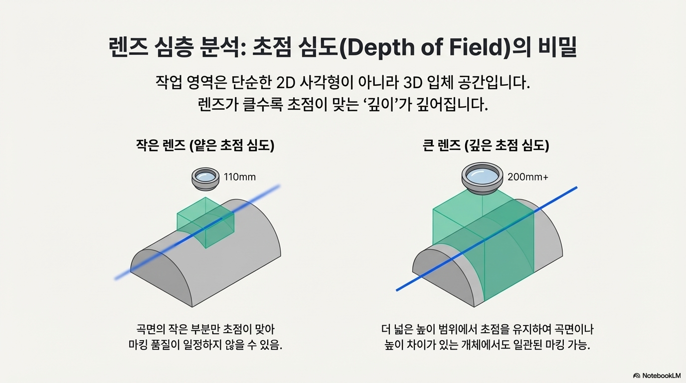 핵심은 작업 영역을 2차원의 '사각형'이 아닌 3차원의 '정육면체'로 이해하는 것입니다. 큰 렌즈는 더 넓은 가로, 세로뿐만 아니라 더 깊은 '높이'를 제공하여 굴곡 있는 소재 작업에 유리합니다. 따라서 자신의 주된 작업이 평평한 면에 고밀도 각인을 하는 것인지, 굴곡 있는 제품에 넓게 마킹하는 것인지를 먼저 파악하고 그에 맞는 렌즈를 선택해야 합니다.