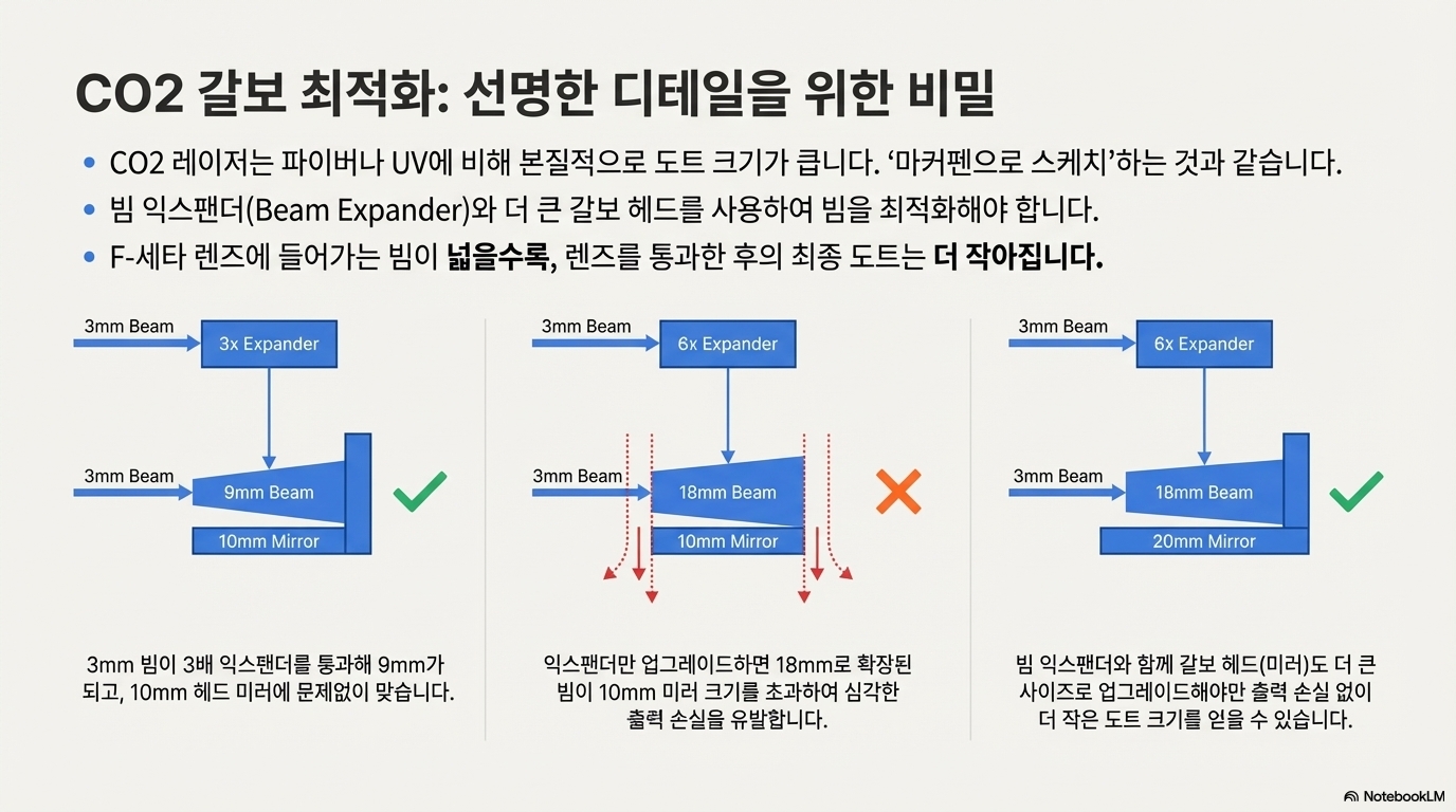 이 '굵은 펜'으로 '섬세한 그림'을 그리려면 어떻게 해야 할까요? 해결책은 바로 **빔 익스팬더(Beam Expander)**를 사용하는 것입니다. 원리는 간단합니다. 레이저 소스에서 나온 빔을 F-theta 렌즈에 도달하기 전에 더 넓게 확장시키면, 렌즈를 통과한 후의 최종 결과물인 점의 크기는 오히려 더 작아집니다. 즉, 렌즈로 들어가는 빔이 넓을수록, 소재에 닿는 점은 더 작아집니다.