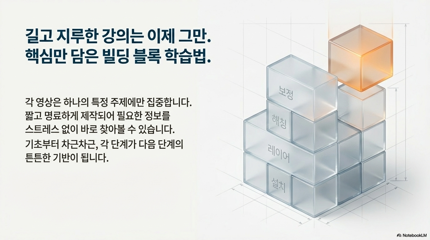 이러한 현대적인 '마이크로러닝(micro-learning)' 접근법은 제작자의 명확한 의도를 보여줍니다. 특정 기능이나 설정에 대한 답을 즉시 찾아 바로 적용하고 싶은 사용자들의 요구를 정확히 파악한 것입니다. 제작자는 강좌의 목표를 다음과 같이 명확히 밝혔습니다.