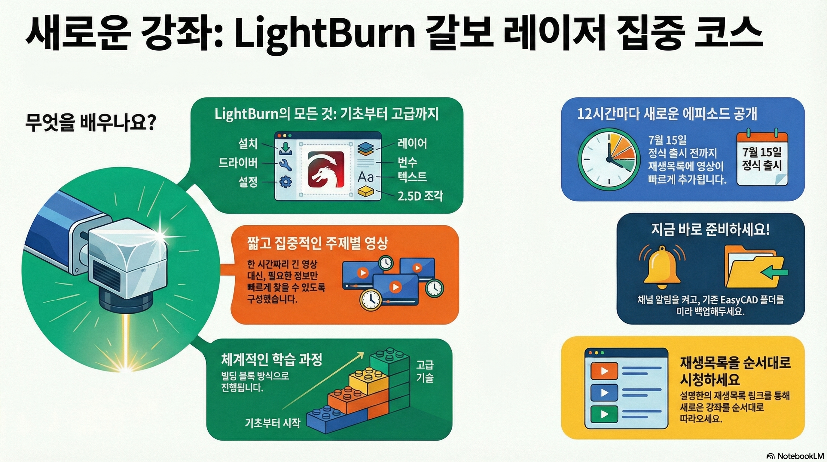 이 강좌는 "EZCAD에서 LightBurn으로 전환하려는" 기존 사용자 또는 LightBurn으로 처음 시작하는 신규 사용자를 명확한 대상으로 삼고 있습니다. 이는 단순한 타겟팅 이상의 전략적 의미를 가집니다. 이 강좌는 수년간 EZCAD에 시간과 노력을 투자한 사용자들이 느끼는 전환의 마찰과 학습 곡선에 대한 부담을 적극적으로 낮추는 역할을 합니다. 즉, 소프트웨어 마이그레이션의 진입 장벽을 허물어 LightBurn이 새로운 업계 표준으로 자리 잡는 과정을 가속화하는, 매우 전략적인 움직임인 셈입니다.