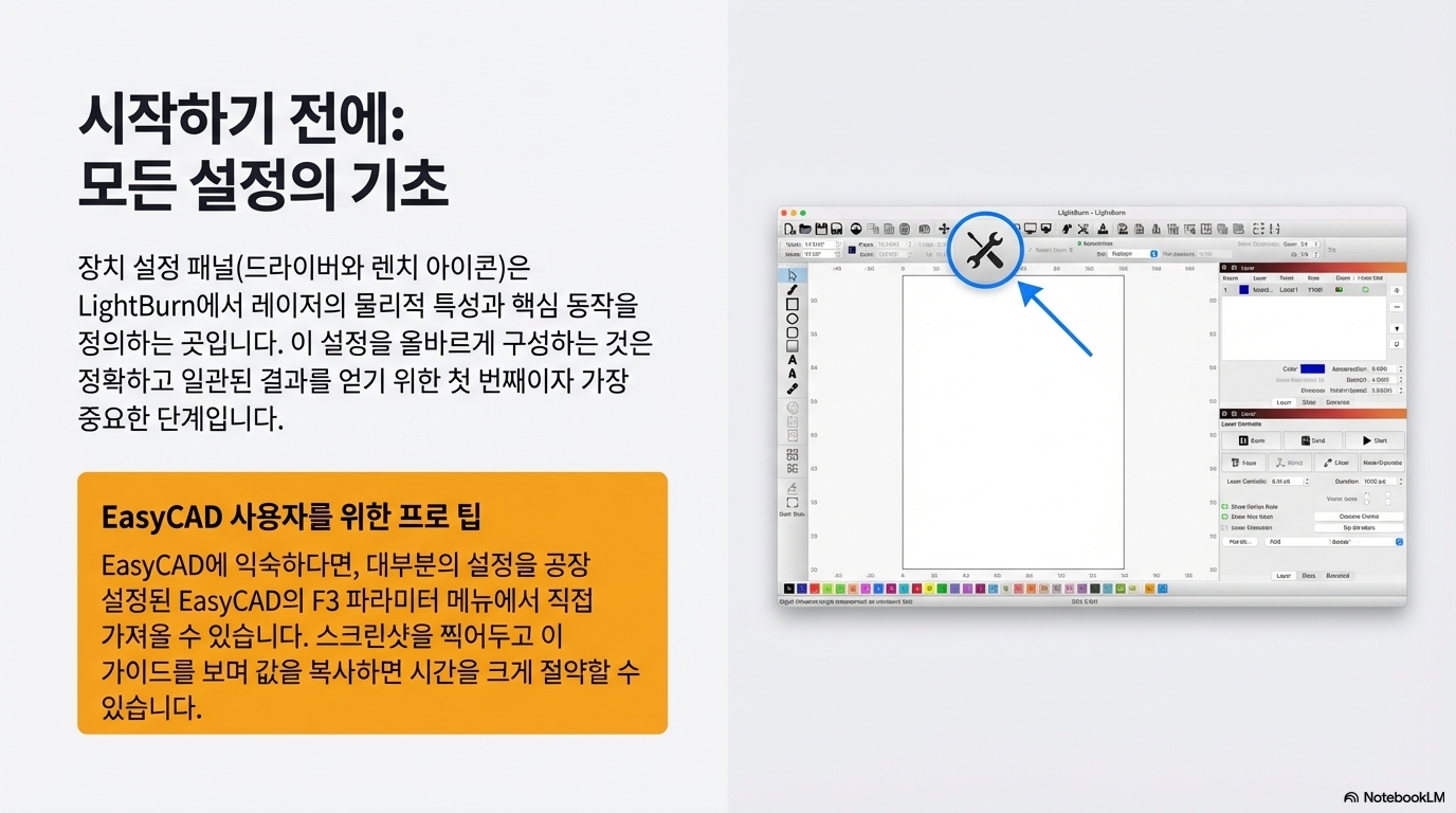 레이저 장비용 소프트웨어 LightBurn을 처음 열었을 때, 수많은 설정 메뉴 앞에서 막막함을 느껴본 적 있으신가요? 특히 갈보 레이저 설정은 복잡하고 혼란스러울 수 있습니다. 대부분의 사용자는 제조업체 문서나 일반적인 튜토리얼에 의존하지만, 거기에는 종종 핵심적인 내용이 빠져 있습니다. 이 글에서는 단순히 설정을 나열하는 것을 넘어, 전문가들도 쉽게 놓칠 수 있는 가장 놀랍고 직관에 반하는 5가지 비밀을 파헤쳐 보겠습니다. 이 설정들은 단순히 편의를 위한 것이 아니라, 여러분의 값비싼 장비 성능을 100% 활용하고, 작업물의 품질을 결정하며, 심지어는 장비의 오작동을 막는 핵심 열쇠입니다. 이 팁들을 통해 여러분의 LightBurn 갈보 설정을 한 단계 끌어올릴 수 있을 것입니다.